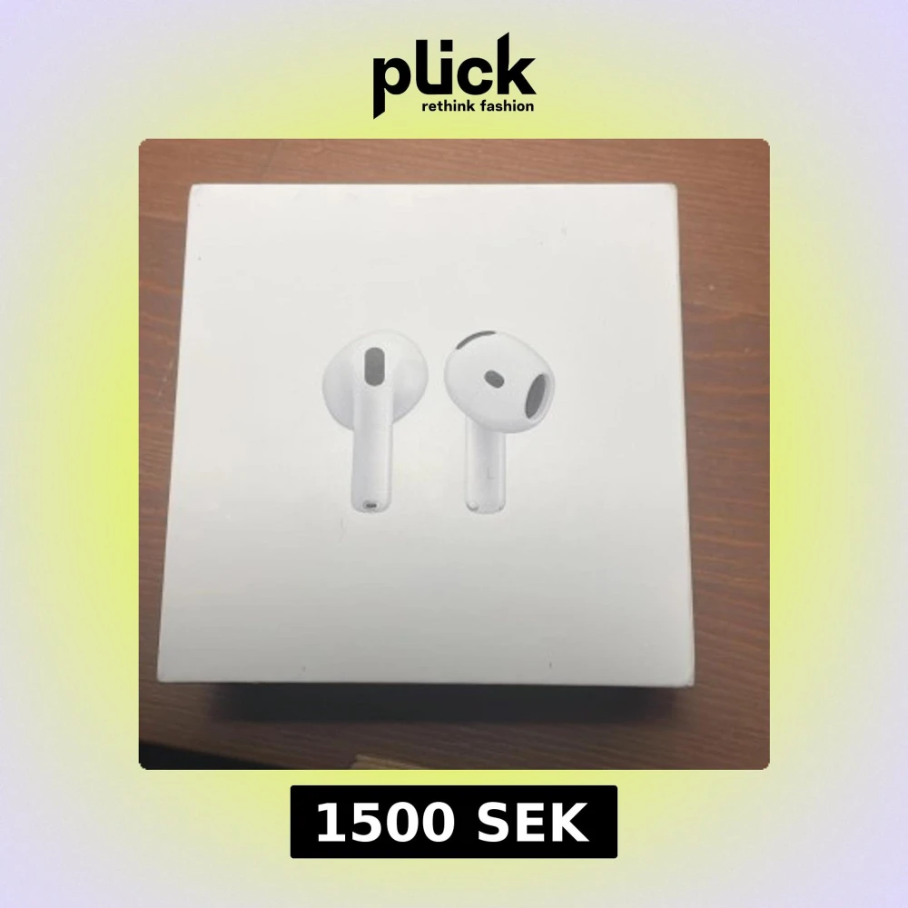 Apple AirPods 4 med laddningsetui, kompatibla med USB-C. Snygg vit design, trådlösa hörlurar med hög ljudkvalitet. Produkten och förpackningen ser ut att vara i mycket gott skick, inga synliga repor eller skador. Perfekt för musik, samtal och smidig anslutning till Apple-enheter.