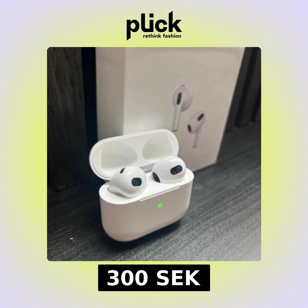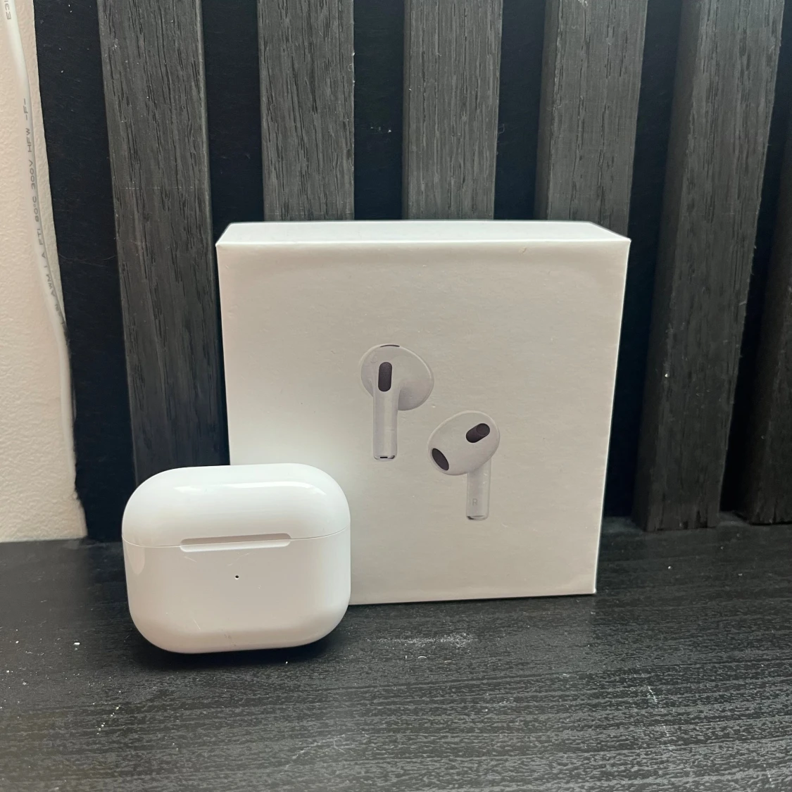 Apple AirPods 3 i mycket fint skick, komplett med originalförpackning. Trådlösa hörlurar med laddningsetui, lång batteritid och smidig anslutning till iPhone och andra Apple-enheter. Inga synliga repor eller skador, fungerar utmärkt. De är inte dock äkta men de är rena och fina och ser ut som äkta.