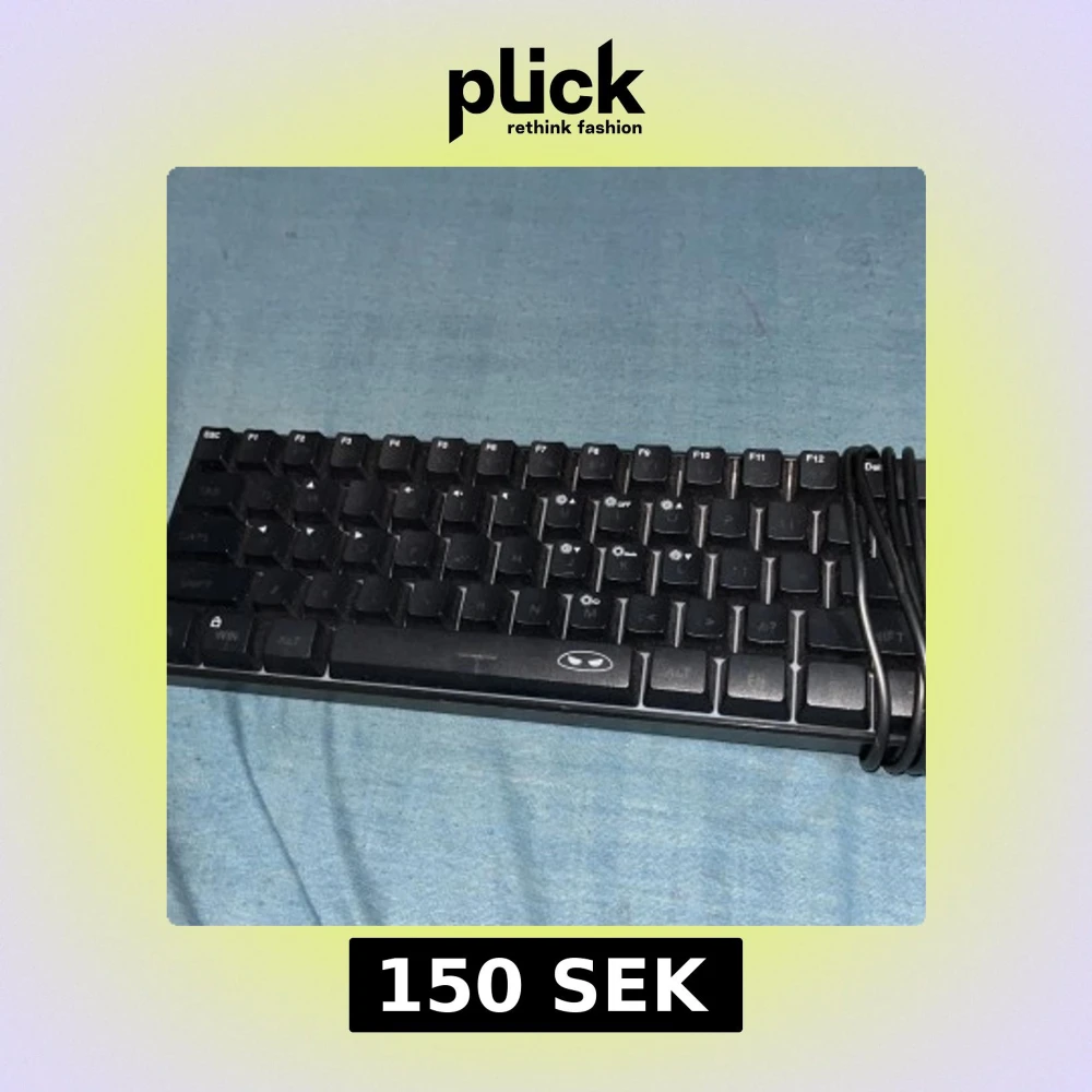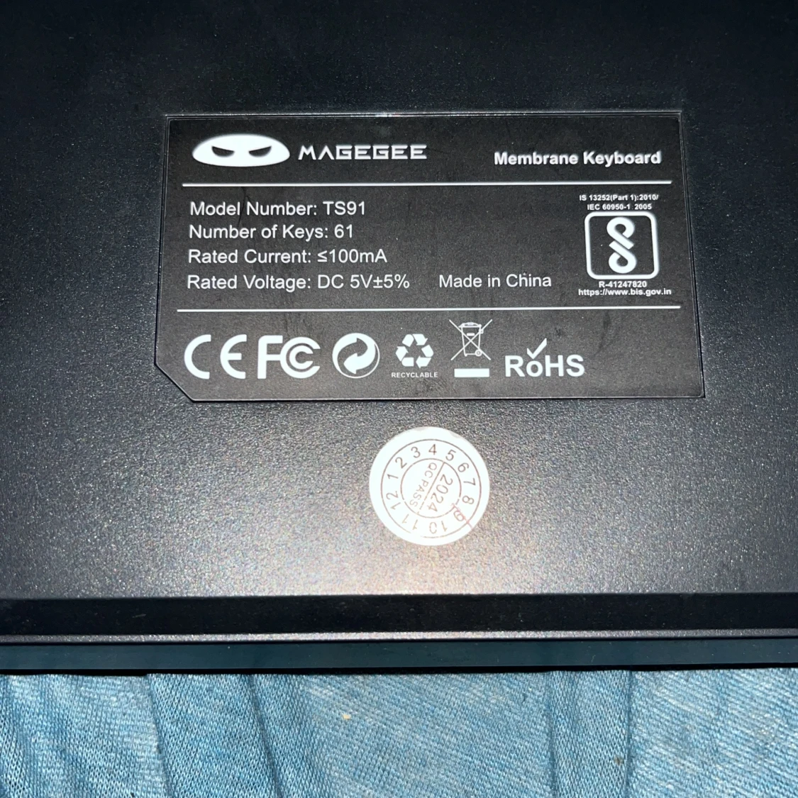 Kompakt MageGee TS91 membrantangentbord med 61 tangenter. Perfekt för gaming eller arbete där platsen är begränsad. Synligt damm men i gott skick, inga uppenbara skador. Ansluts via kabel, DC 5V. Snygg design med unikt logotryck på mellanslagstangenten.
