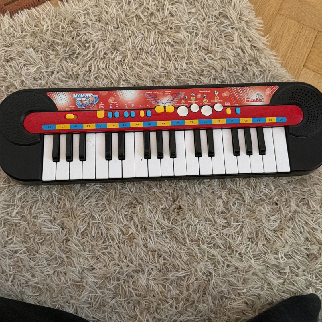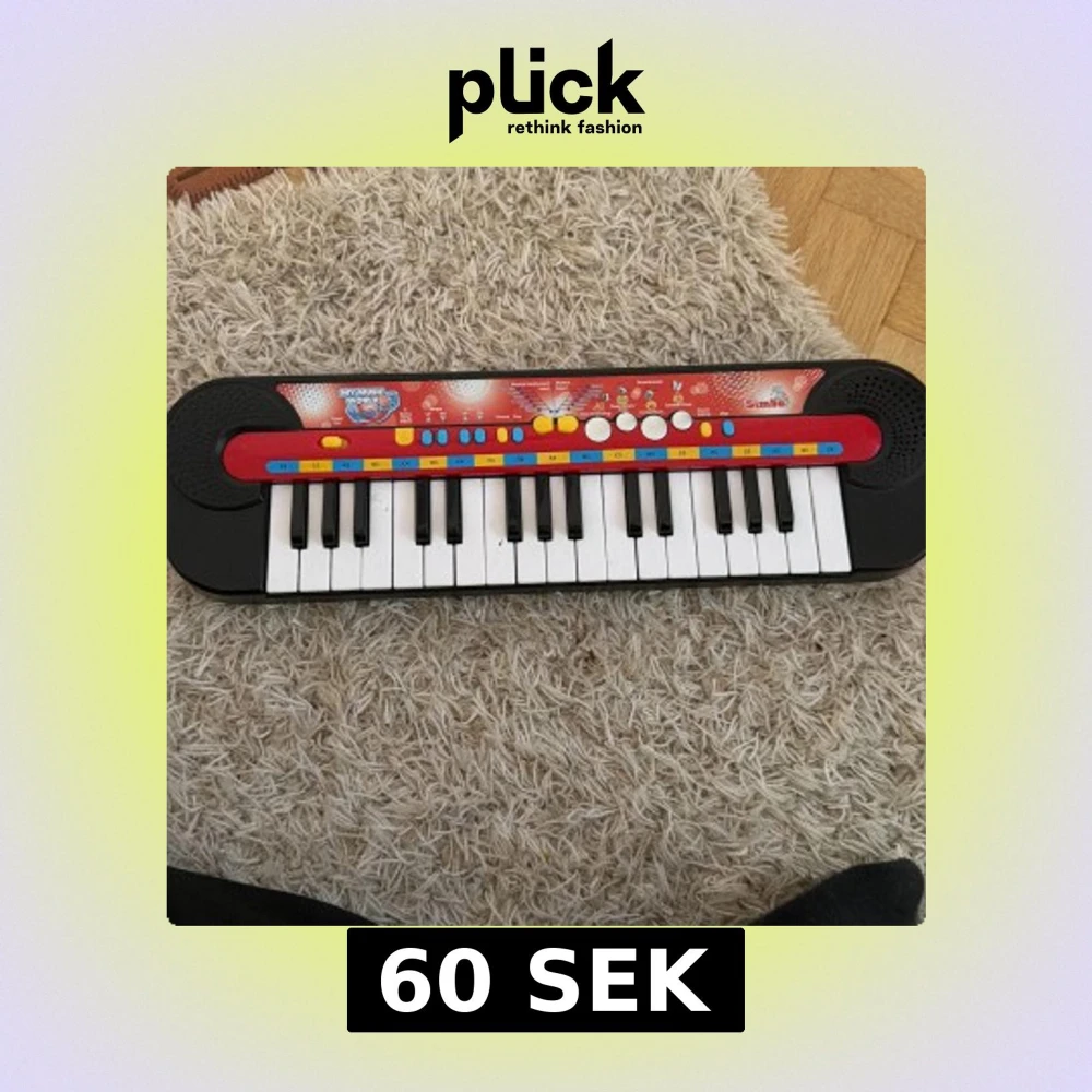 Färgglad leksakssynt från Simba, modell My Music World. Utrustad med 24 tangenter, inbyggda högtalare och flera ljud- och rytmval. Perfekt för barn som vill utforska musik. Tangenter och knappar i gott skick, inga synliga defekter. Fungerar utmärkt!