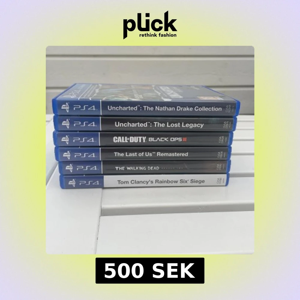 6 stycken. Säljer följande PlayStation 4-spel, alla i mycket gott skick: The Last of Us: Remastered The Walking Dead: Season Two Tom Clancy's Rainbow Six Siege Uncharted: The Nathan Drake Collection (Innehåller Uncharted 1, 2 och 3) Uncharted: The Lost Legacy Call of Duty: Black Ops III
