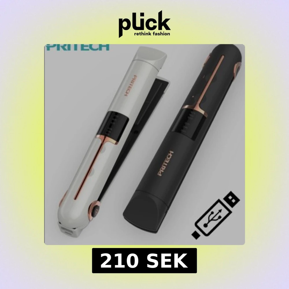 Elegant och portabel hårplattång från Pritech med USB-laddning. Finns i svart och vitt med roségulddetaljer. Flera värmeinställningar synliga på displayen. Perfekt för resor och snabb styling. Produkten ser helt ny ut utan synligt slitage.