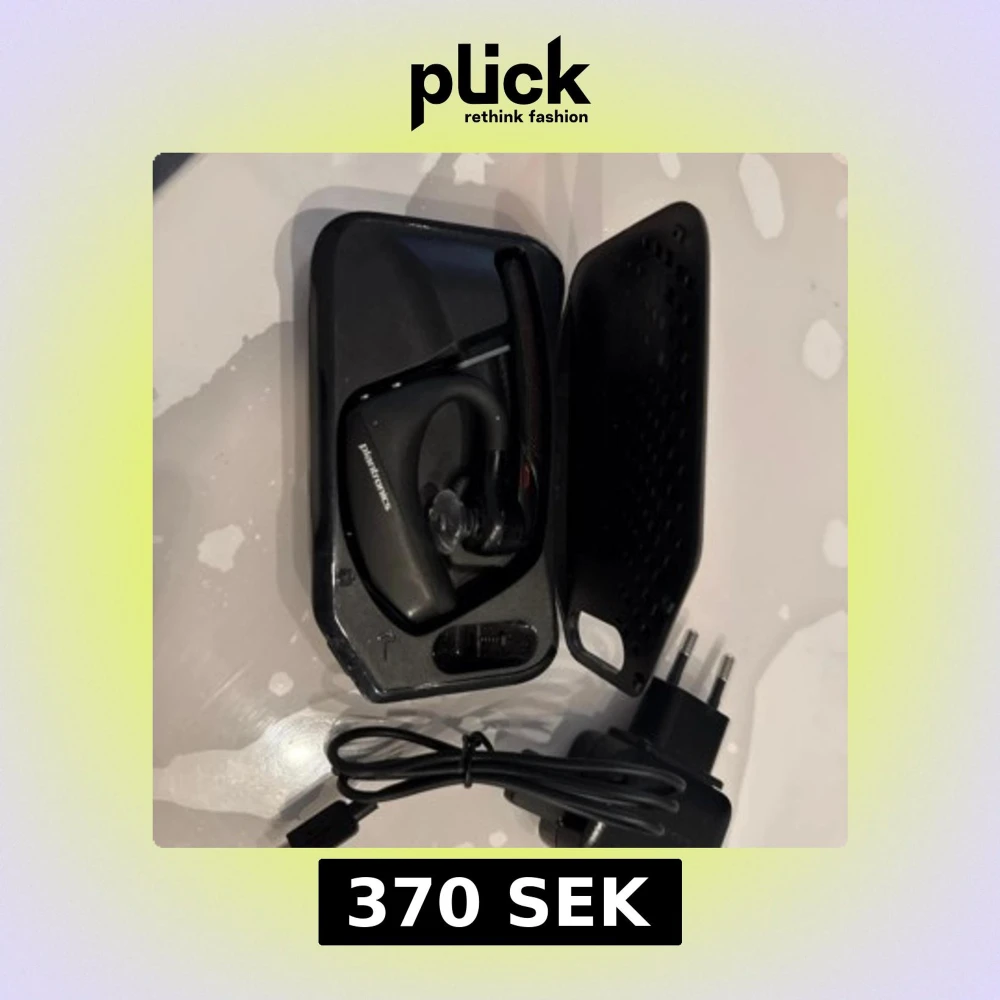 Trådlöst Plantronics headset med laddningsfodral och laddare. Perfekt för handsfree-samtal och lång batteritid. Headsetet ser ut att vara i gott skick utan synligt slitage. Levereras komplett med tillbehör.