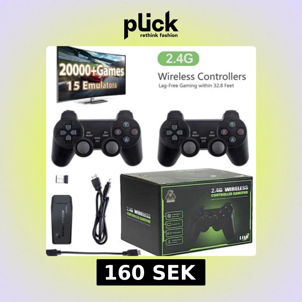 Trådlöst spelkontrollpaket med två handkontroller, USB-mottagare och kablar. Stödjer över 20 000 spel och 15 emulatorer. Perfekt för retrospel och PC. Kontrollerna har klassisk design och ser ut att vara i nyskick utan synligt slitage.
