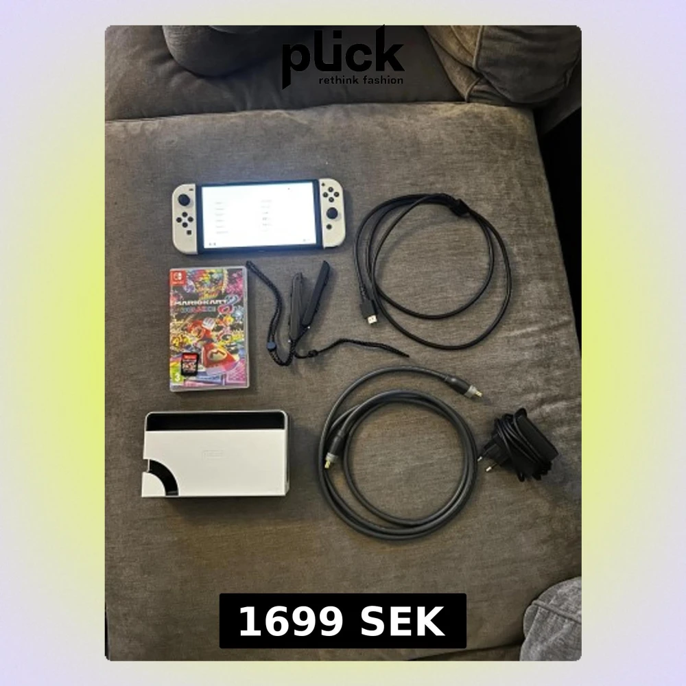 Nintendo Switch OLED i mycket fint skick, komplett med originaltillbehör, vit docka, Joy-Con-kontroller, laddare, HDMI-kabel och spelet Mario Kart 8 Deluxe. Skärmen och tillbehören ser ut att vara i bra skick utan synliga skador eller slitage.