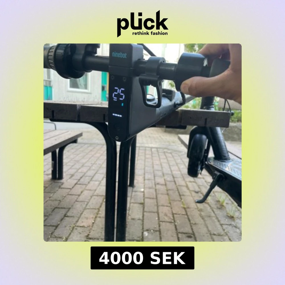 Ninebot elscooter med digital display, maxhastighet 25 km/h. Robust konstruktion, slitstark plattform och hjul. Några tecken på normalt bruksslitage, men i gott skick. Perfekt för smidig och miljövänlig pendling i staden.