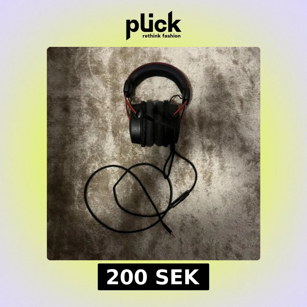 HyperX Cloud Alpha gaming headset med kabelanslutning och avtagbar mikrofon. Robust design med röd aluminiumram och bekväma öronkuddar. Headsetet är i gott skick med mindre tecken på normalt bruk, perfekt för spel och kommunikation.
