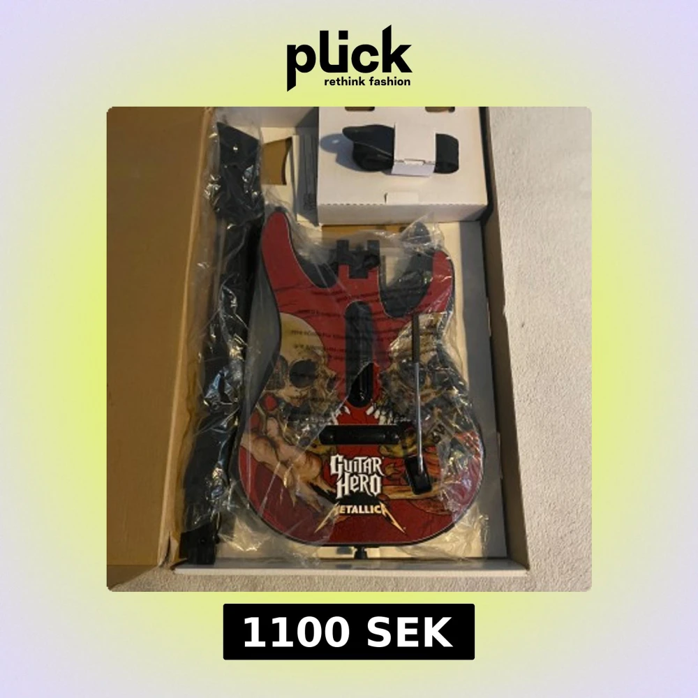 Guitar Hero Metallica gitarrkontroller i originalkartong, ser oanvänd ut med plasten kvar på delarna. Inkluderar två utbytbara kroppar (Metallica och sunburst), hals, rem och tillbehör.