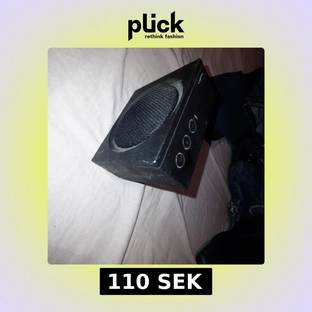 Kompakt Nedis SPBT2000BK Bluetooth-högtalare med tydliga knappar för volym och uppspelning. Svart färg, USB-laddning. Synligt yttre slitage och damm, men inga större skador. Perfekt för trådlös musik hemma eller på resan. Där finns en och en annan skråma men funkar perfekt som när jag köpte den!