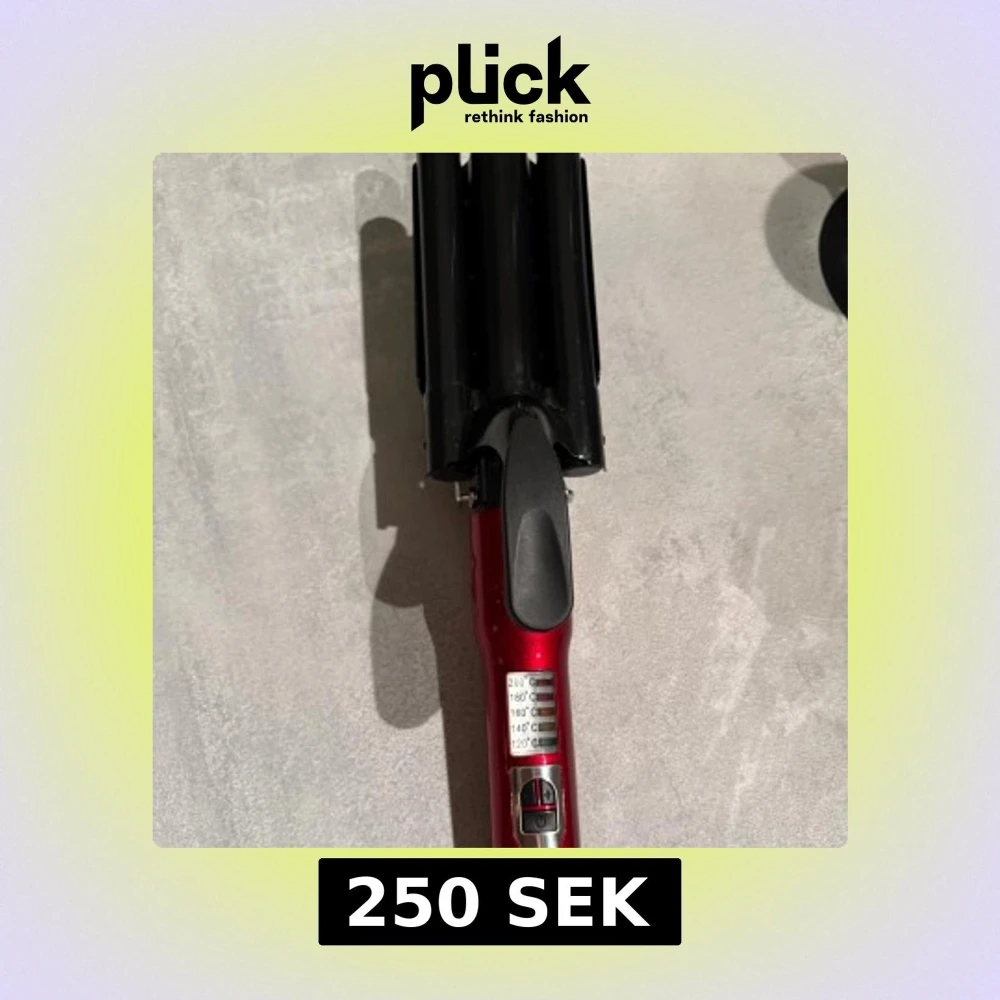 Röd locktång med tre cylindrar och justerbar temperatur (120–200°C). Passar för att skapa volym och vågor i håret. Synligt i gott skick, inga större repor eller defekter. Perfekt för styling hemma.