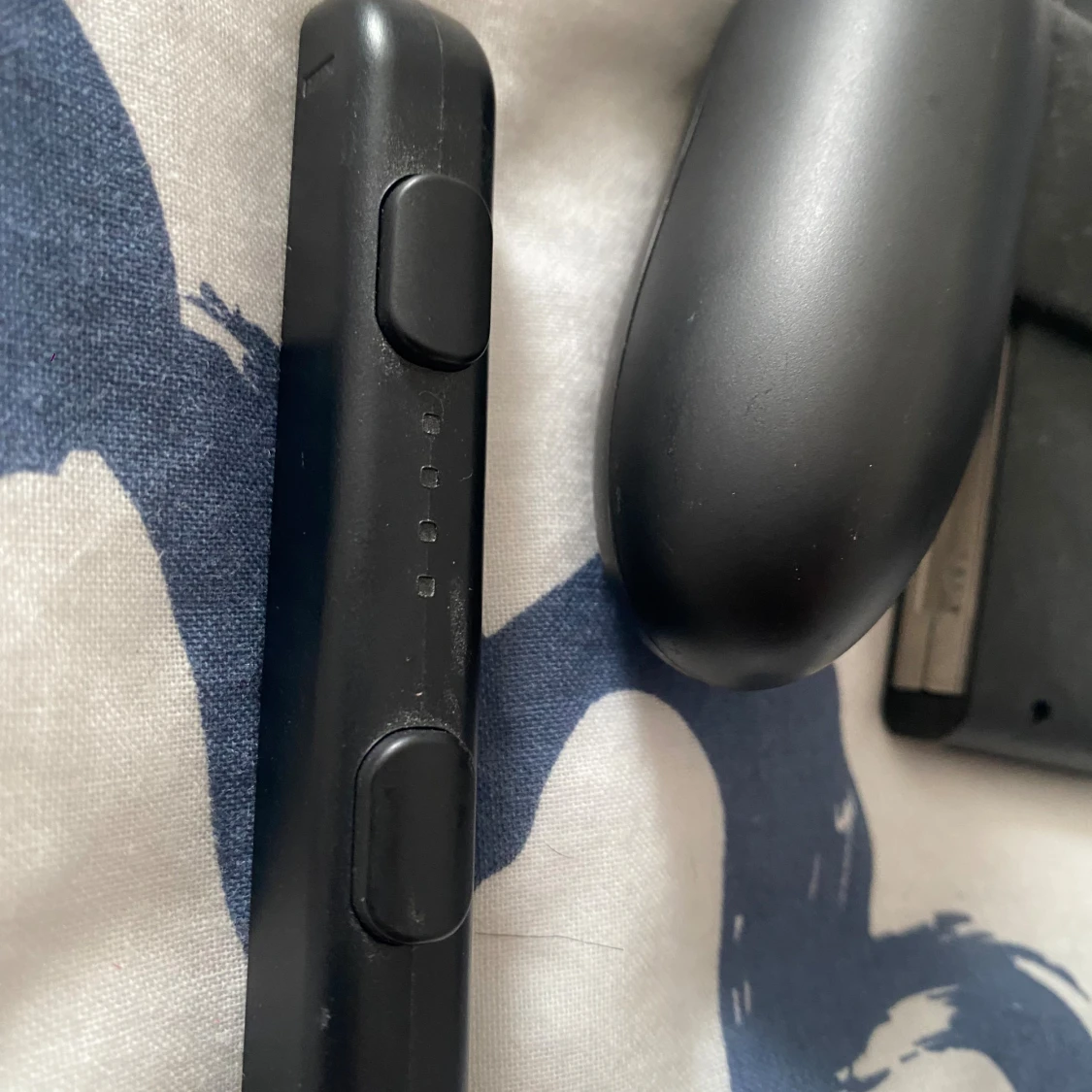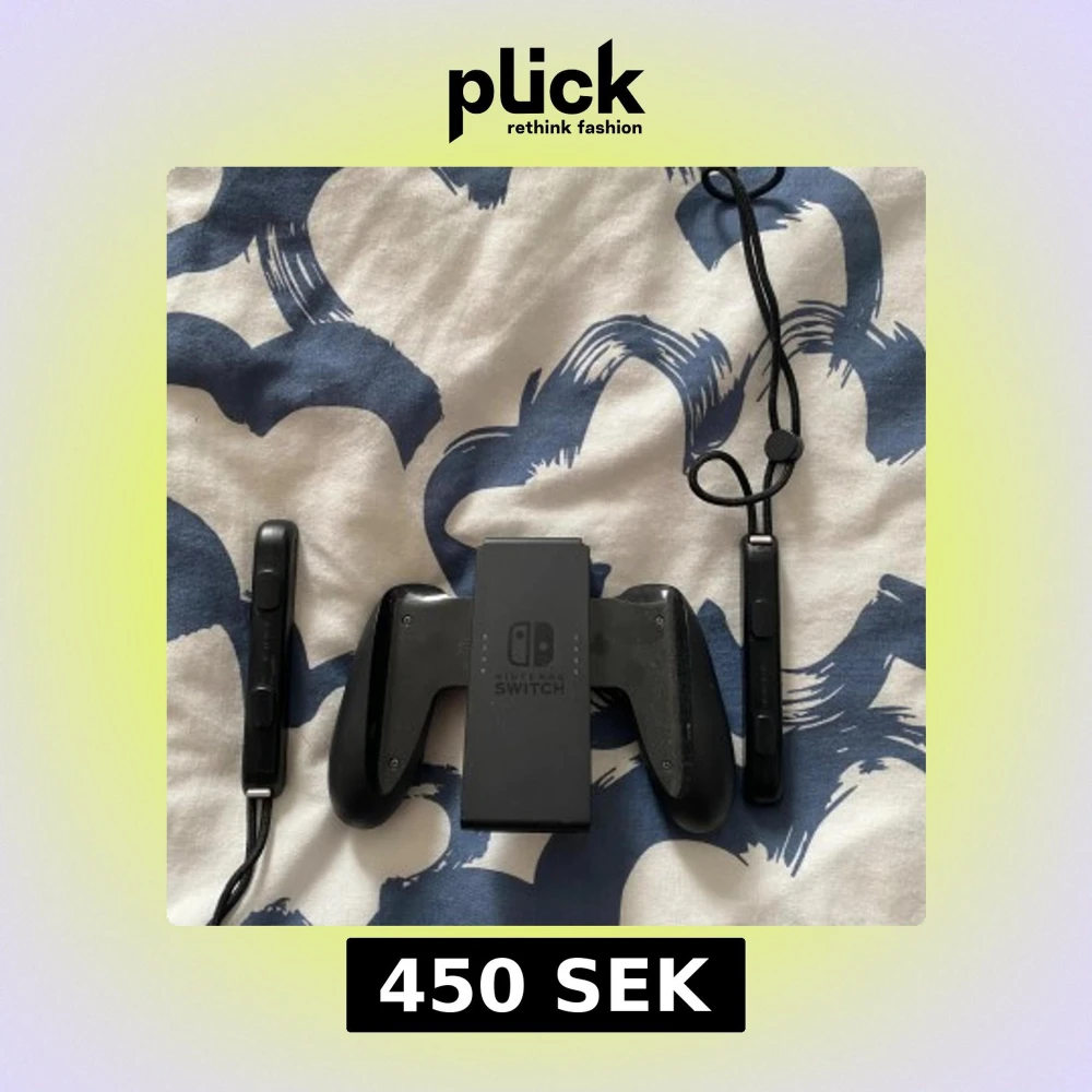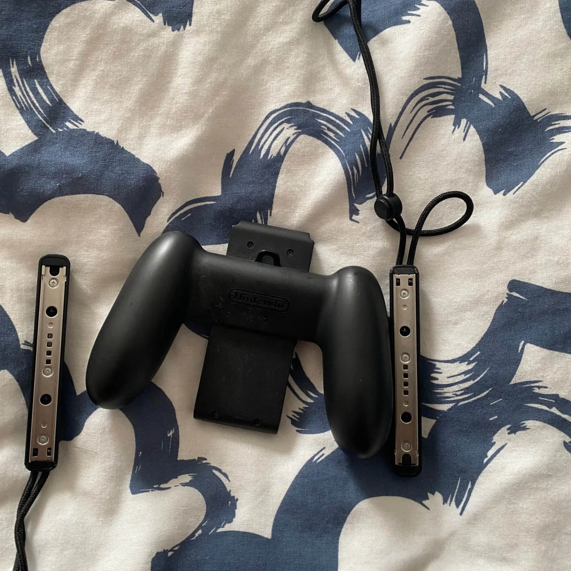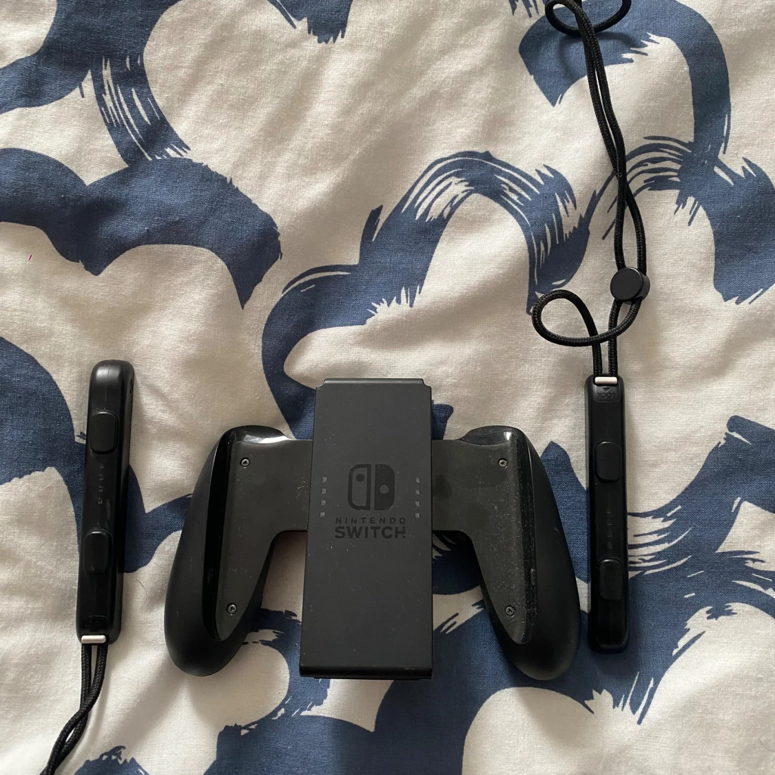 Nintendo Switch Joy-Con Grip och två Joy-Con Remmar i svart. Passar perfekt för att spela med Joy-Cons som en traditionell handkontroll. Remmarna har handledsband för extra säkerhet. Mindre repor och normalt bruksslitage syns, men allt är i gott skick.