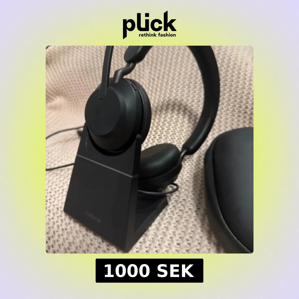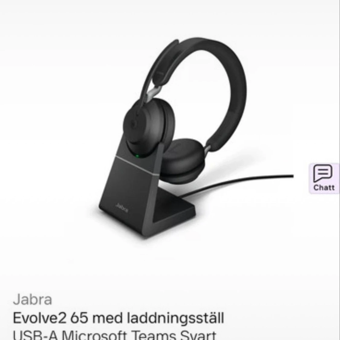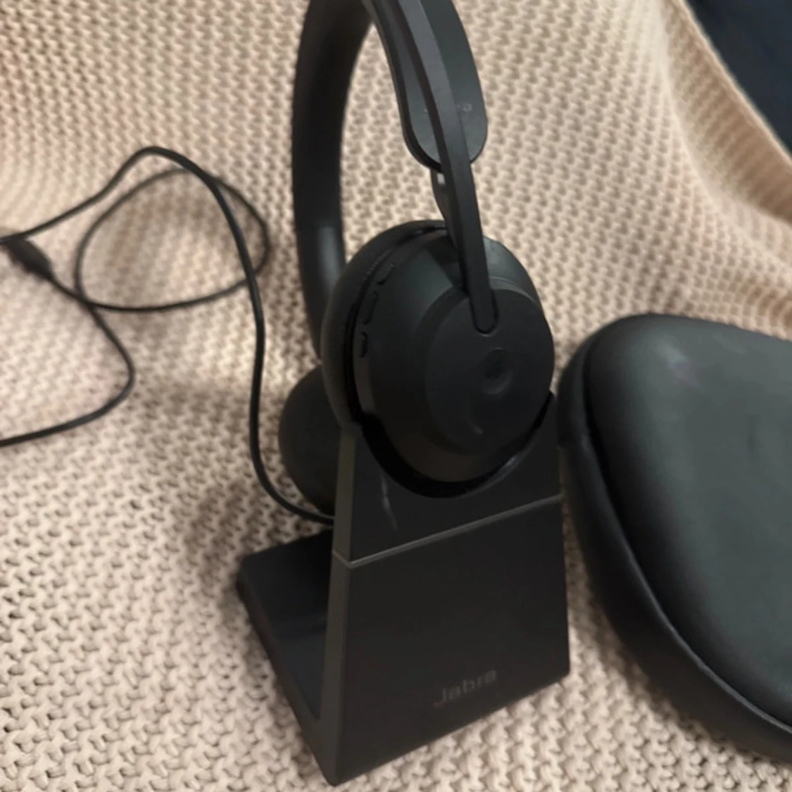 Jabra Evolve2 65 trådlöst headset med laddningsställ och USB-A, optimerat för Microsoft Teams. Svart färg, med tillhörande hårt fodral. Headsetet ser ut att vara i mycket gott skick utan synligt slitage eller defekter.