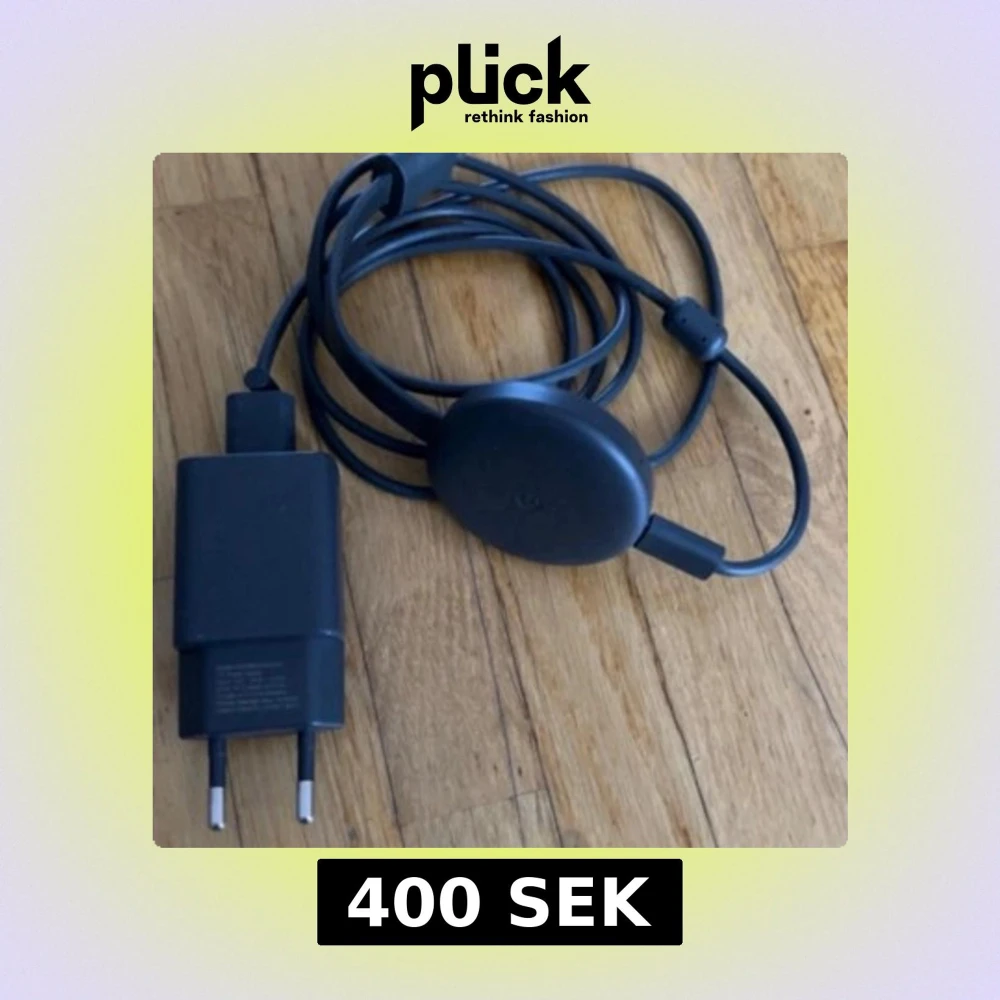 Google Chromecast mediaströmningsenhet med strömadapter och kabel. Perfekt för att streama video och musik till din TV.