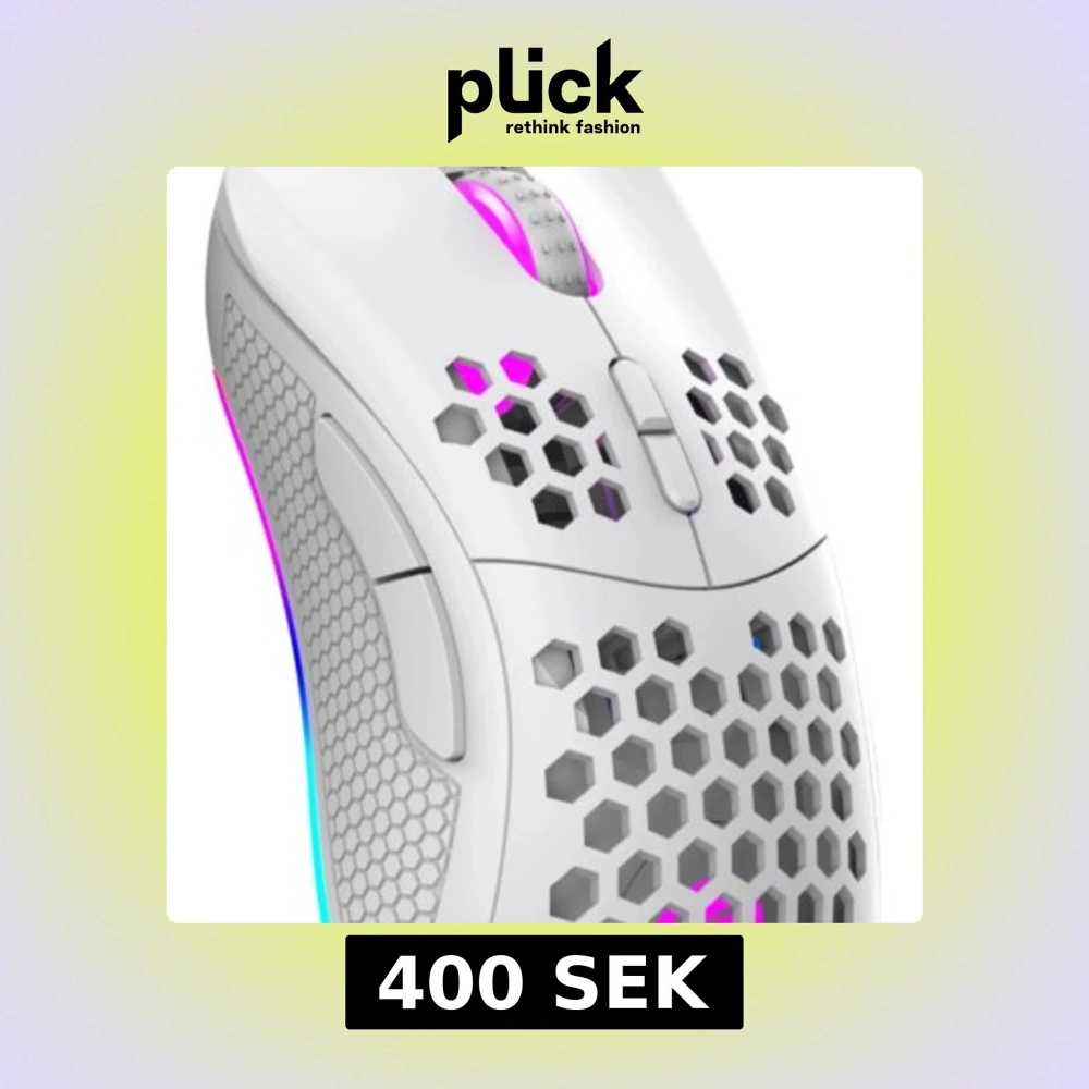 Modern gamingmus i vitt med RGB-belysning och honeycomb-design för låg vikt. Sidorna har greppvänlig yta och extra knappar. Perfekt för snabba spelmoment. Inga synliga defekter eller slitage, ser ut att vara i mycket gott skick.