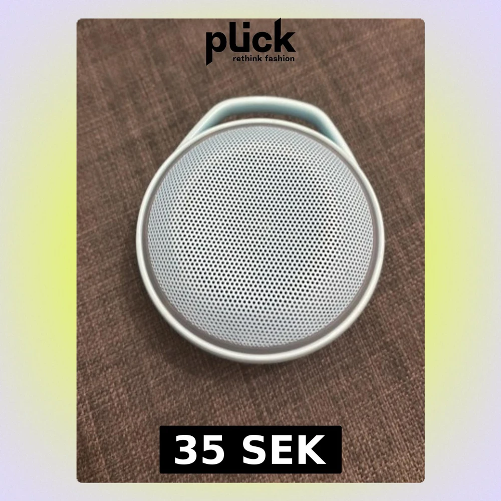 Snygg portabel högtalare i rund form med ljusblått plasthölje och metallgaller framtill. Smidig att ta med tack vare handtaget upptill. Enkel on/off-knapp på baksidan. Perfekt för att spela musik trådlöst var du vill.