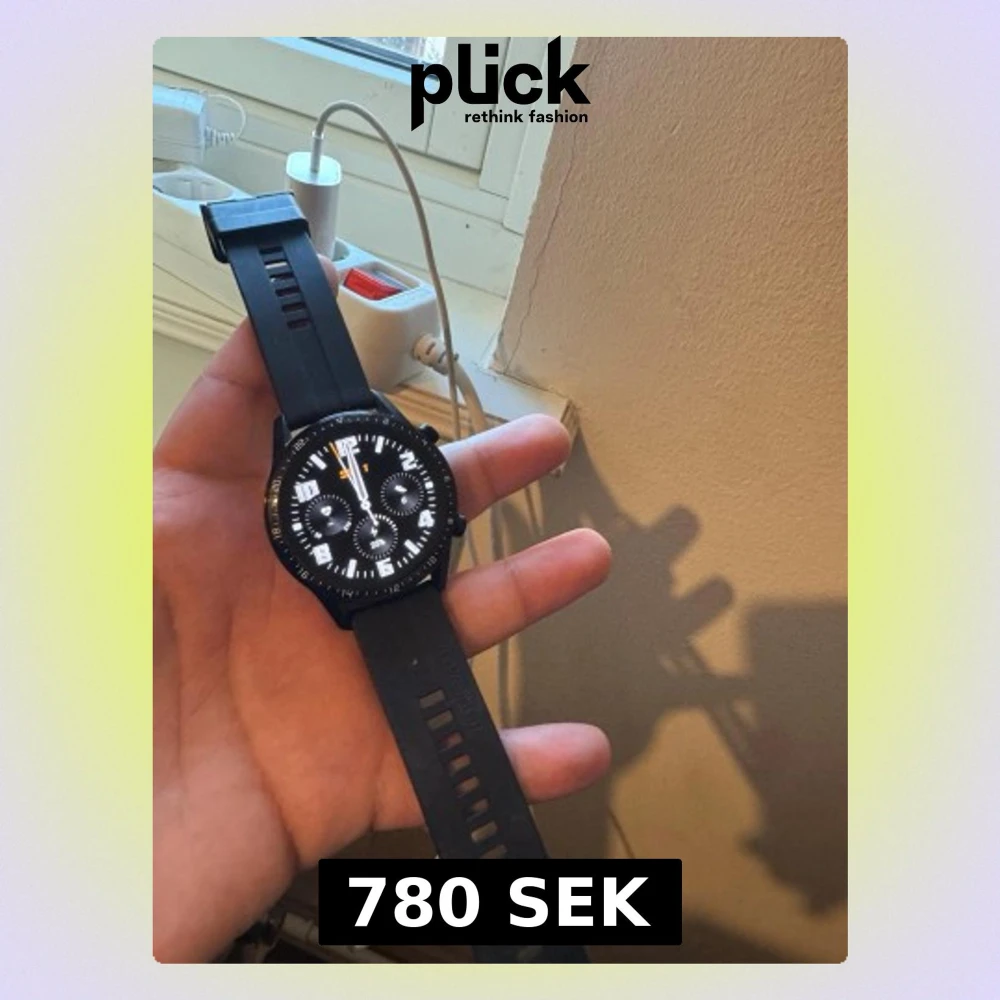 Huawei Watch GT smartklocka med sportig design och svart silikonarmband. Skärmen är aktiv och visar tydligt gränssnitt. Laddare medföljer dock utan sladd. Klockan är i mycket god skick. Den är knappt använt!