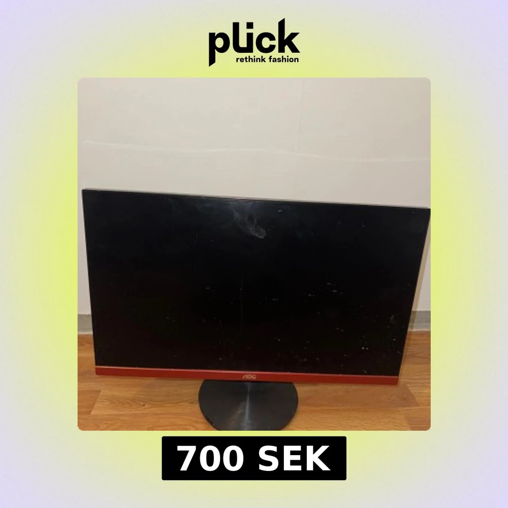 Snygg AOC 24-tums LED-skärm med tunn ram och röd detalj. Skärmen har några synliga fingeravtryck och mindre repor på ytan, men är i gott skick och fungerar utmärkt. Perfekt för både arbete och gaming. Stabil fot och modern design.