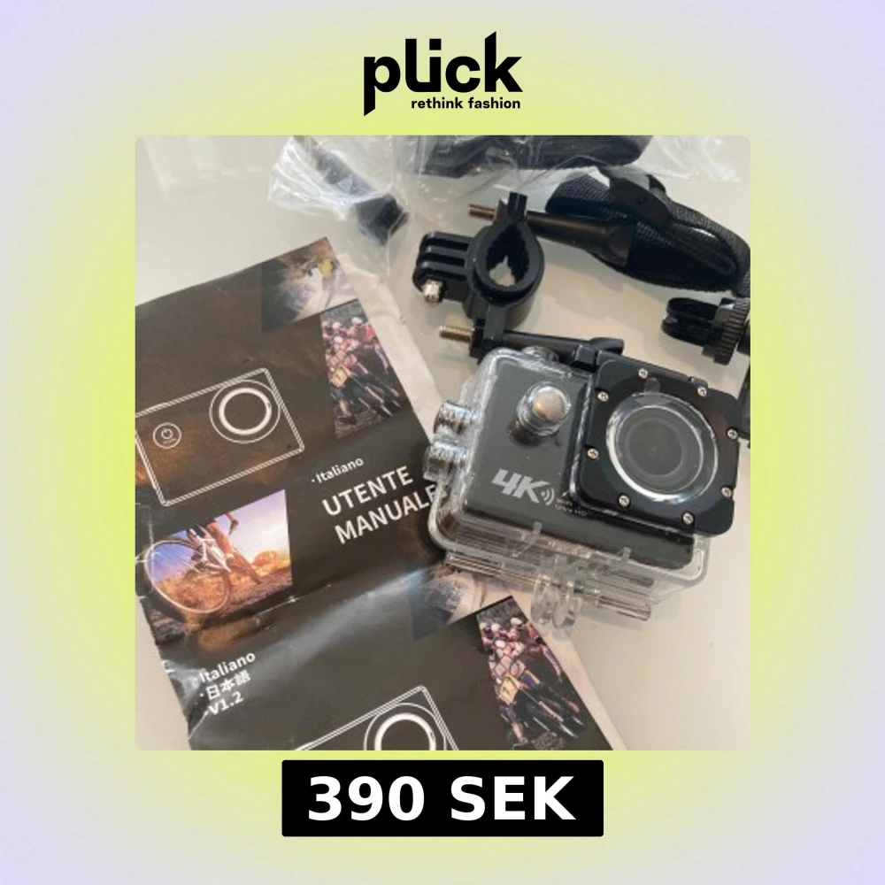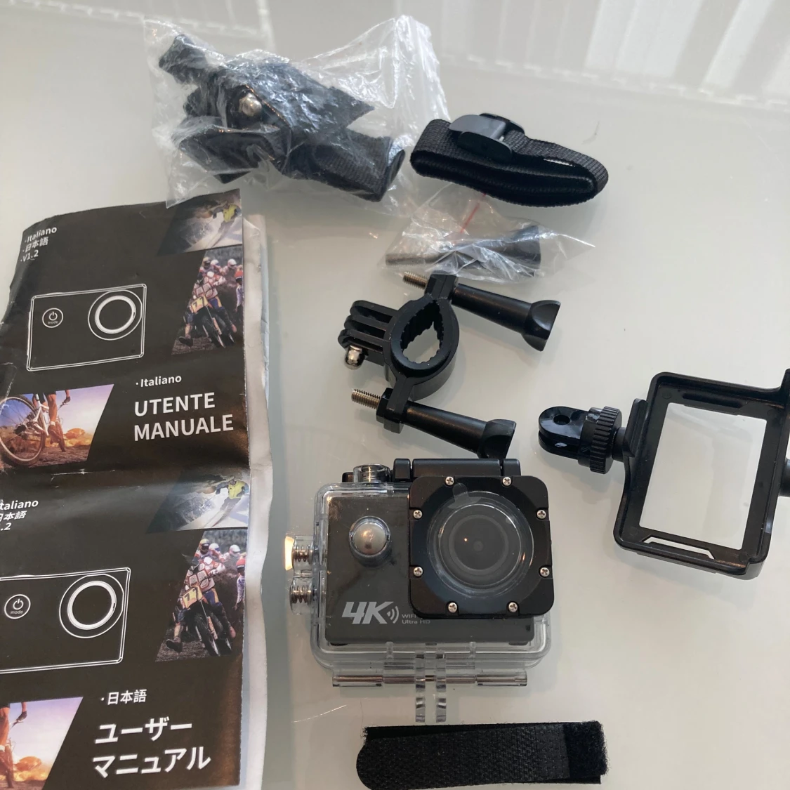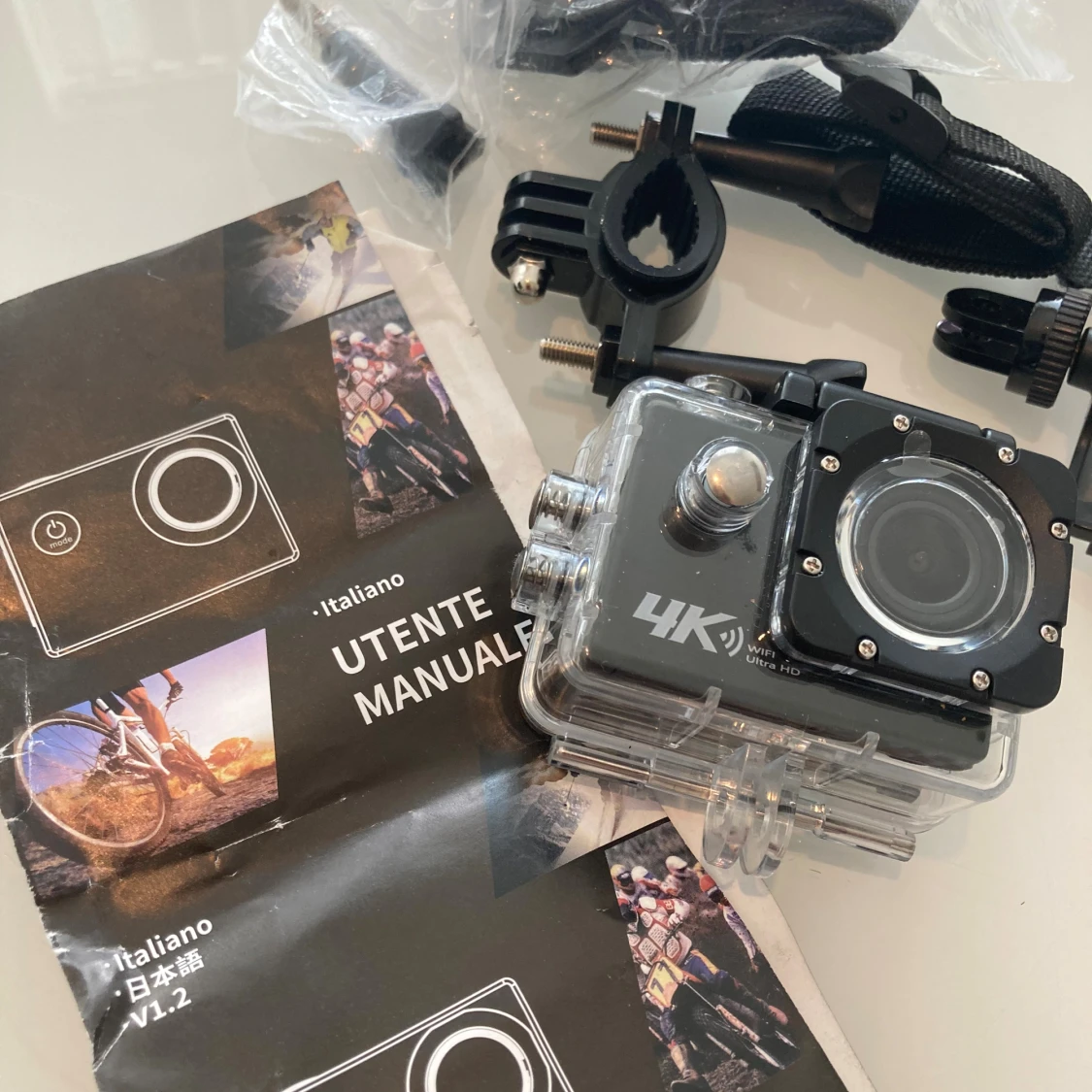 Actionkamera med 4K-upplösning och WiFi, levereras med vattentätt hus, fästen och manual. Perfekt för sport och äventyr. Kameran och tillbehören ser ut att vara i gott skick, inga synliga skador eller slitage.