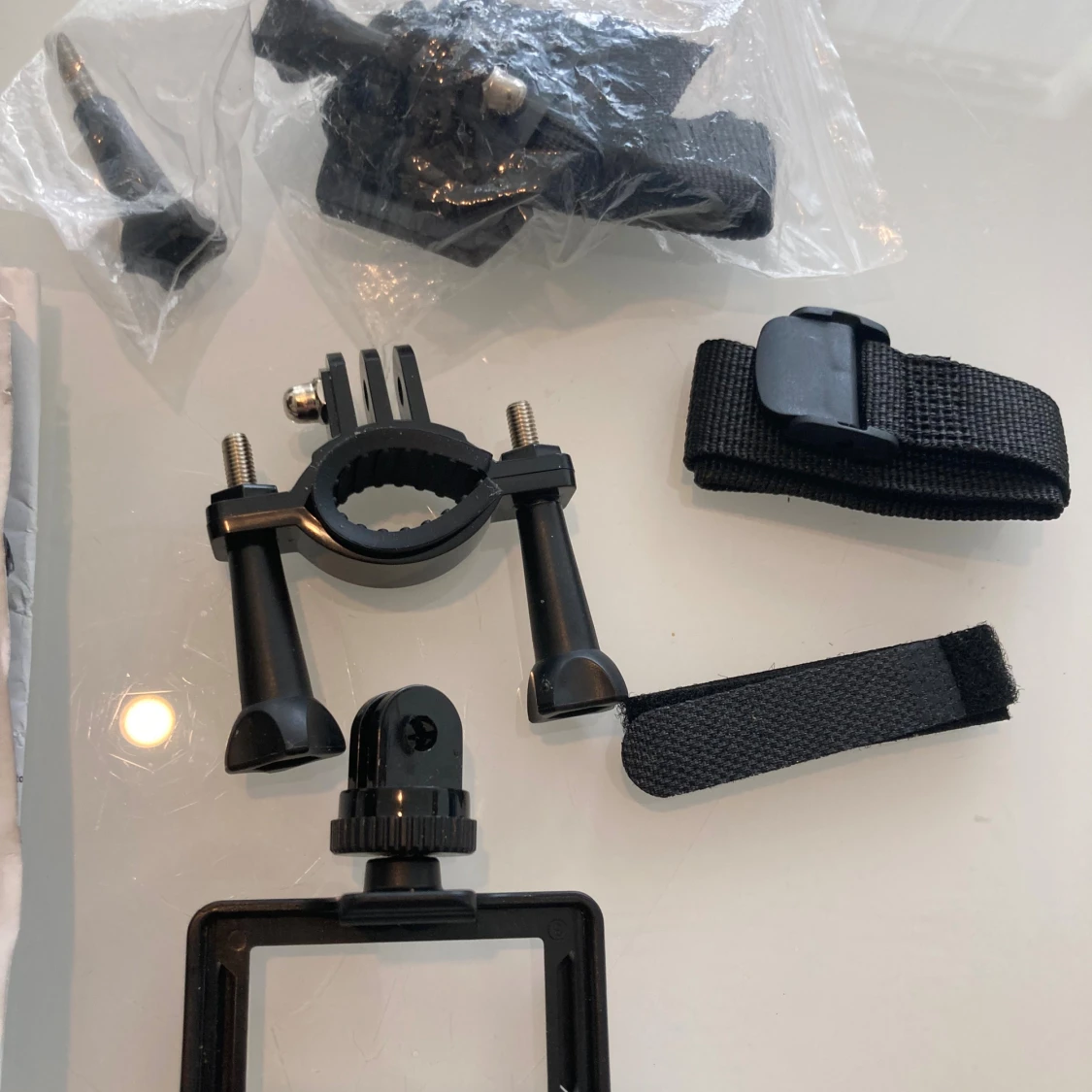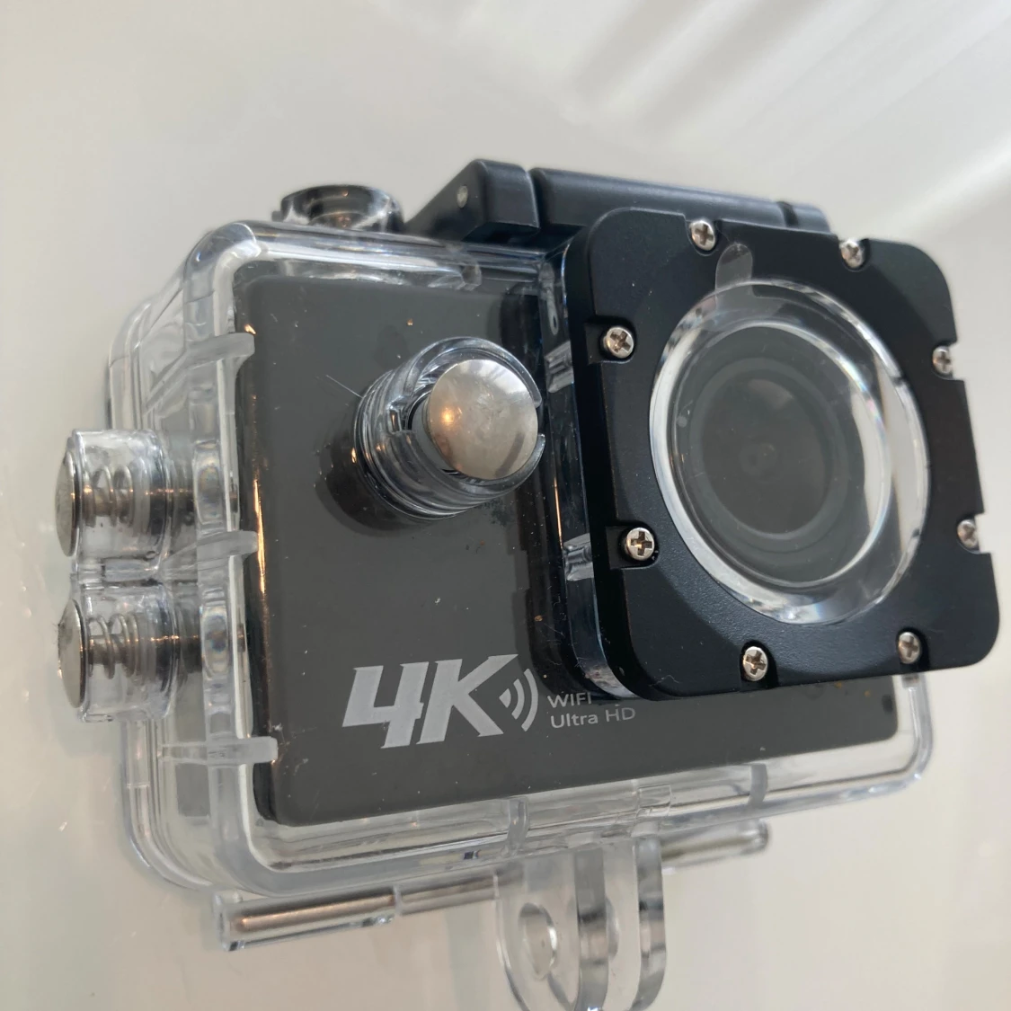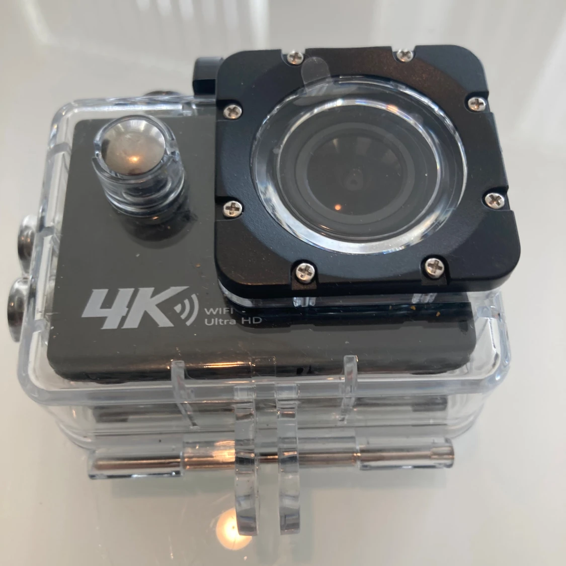 Actionkamera med 4K-upplösning och WiFi, levereras med vattentätt hus, fästen och manual. Perfekt för sport och äventyr. Kameran och tillbehören ser ut att vara i gott skick, inga synliga skador eller slitage.