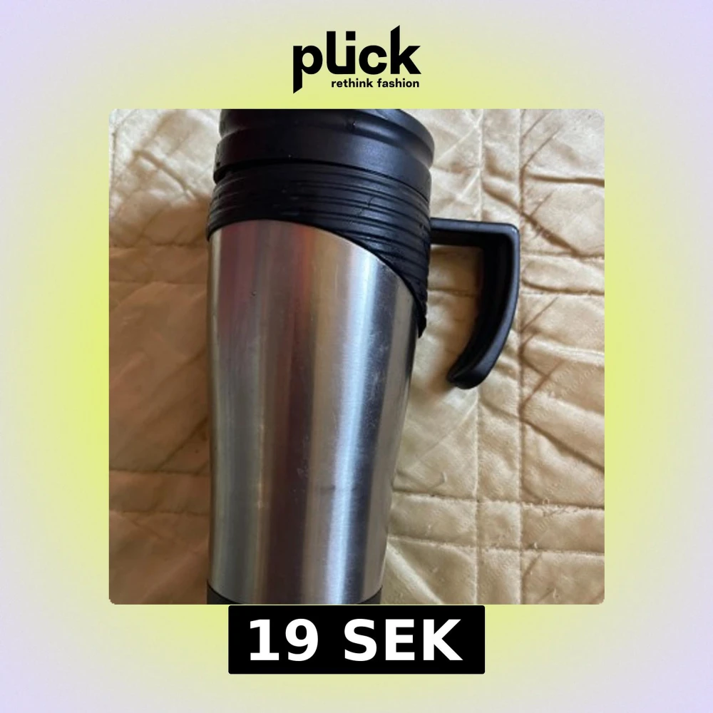 Praktisk termosmugg i rostfritt stål med svart plastlock och handtag. Perfekt för kaffe eller te på språng. Muggen är i gott bruksskick. Locket är avtagbart och har en öppning för att dricka direkt ur muggen.