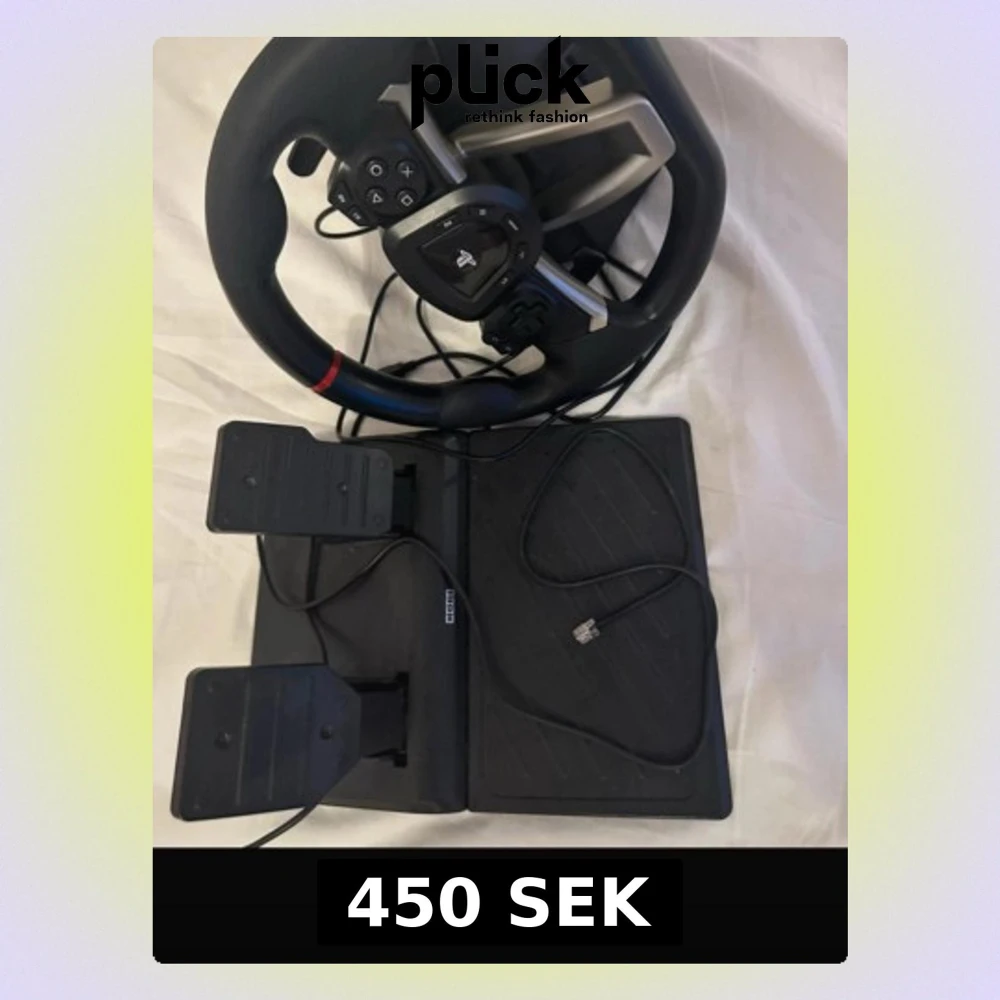 Säljer en svart Thrustmaster ratt och pedaler till gaming. Ratten har flera knappar, paddlar i metall och en röd detalj upptill. Pedalerna är i plast och kopplas ihop med kabel. Perfekt för racing på konsol eller PC.