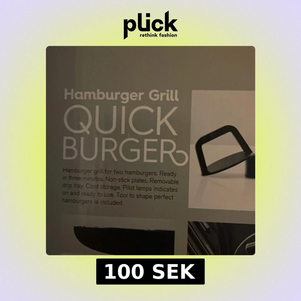 Praktisk hamburgergrill för två hamburgare, klar på tre minuter. Utrustad med non-stick plattor, avtagbar droppbricka, sladdförvaring och pilotlampa. Verktyg för att forma perfekta hamburgare ingår. Grillen ser ut att vara i gott skick utan synligt slitage.