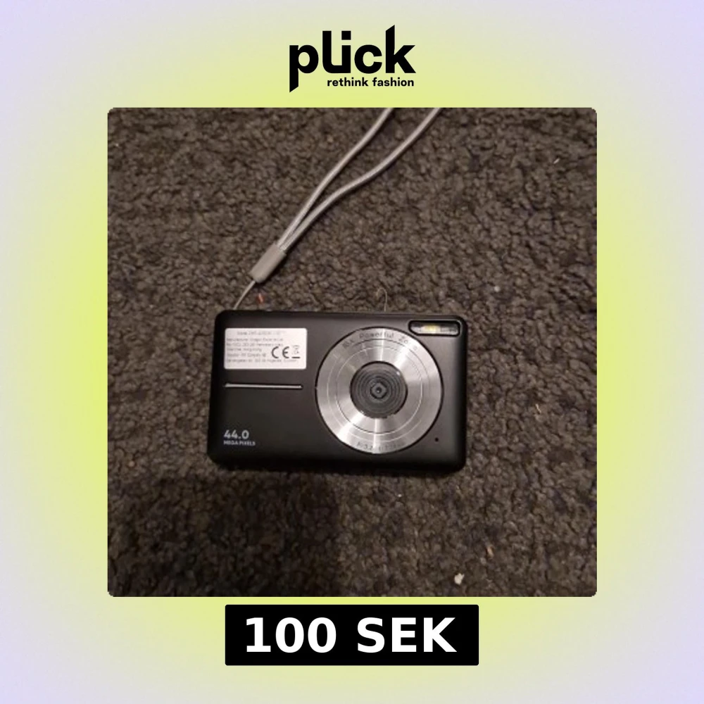 Kompakt digitalkamera med 44 MP upplösning och 16x zoom. Levereras med laddare och skyddspåse. Kameran har en stor display och flera funktionsknappar. Skicket ser bra ut utan synligt slitage eller defekter.