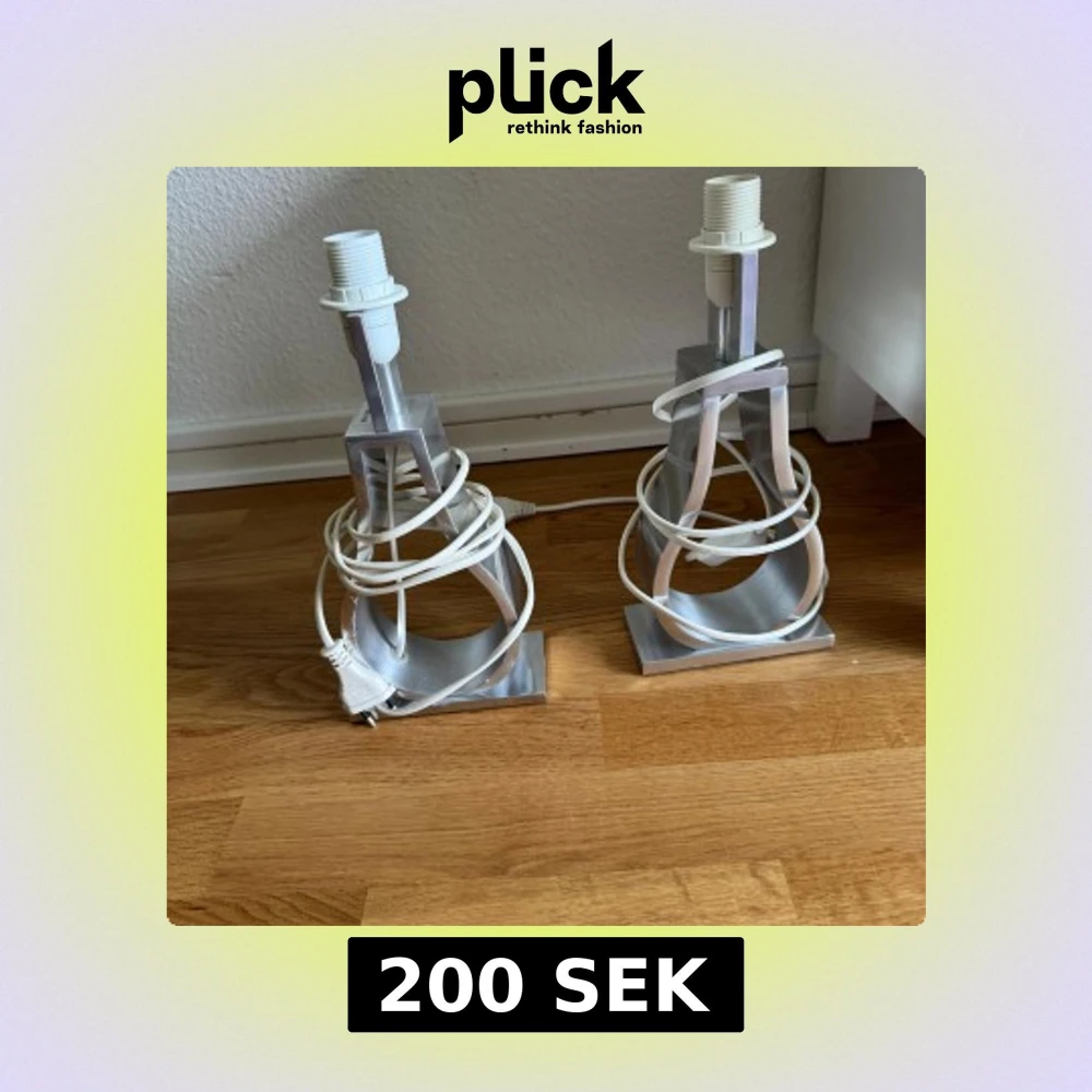 Bilden visar två moderna bordslampor i metall med vit sladd. Lamporna har en unik, industriell design och är i gott skick utan synliga skador. Perfekta för att ge ett stilrent intryck i hemmet. Lampskärmar och glödlampor ingår ej.