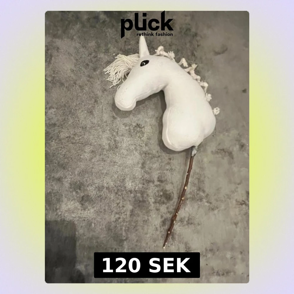 Unik hobby horse i form av en vit enhörning med mjuk plysch, garnman och träpinne. Passar perfekt för lek och fantasi. Skicket är gott, med mindre tecken på användning och lite slitage på pinnen. Inga synliga större defekter. Perfekt för barn som älskar hästar och enhörningar. Och den är hem jord