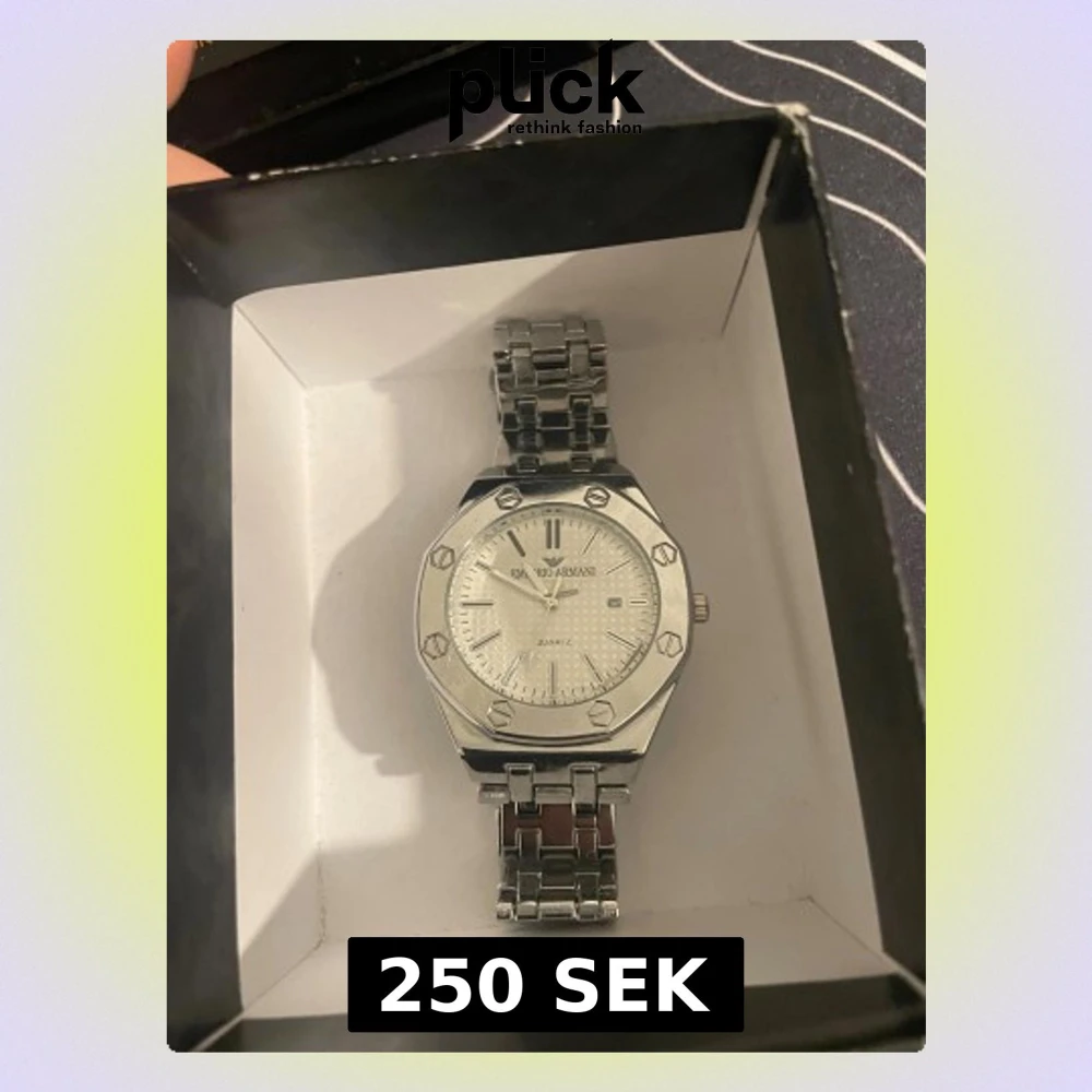 Snygg klocka från Emporio Armani med silverfärgat armband i metall och oktagonformad boett. Urtavlan är ljus med subtilt mönster och har datumvisning. Klockan har en stilren design med markerade skruvar på boetten och klassisk länkarmband.