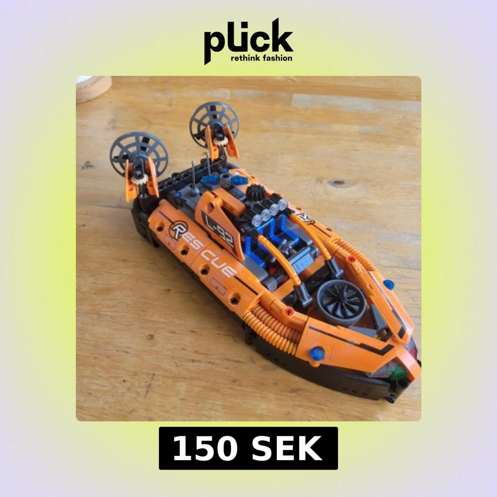 Snygg LEGO Technic Rescue Hovercraft i orange och svart, komplett med detaljerade propellrar och räddningsdekaler. Modellen har hjul och en ratt som man kan styra med. Den är i mycket gott skick och inga synliga skador eller saknade delar.