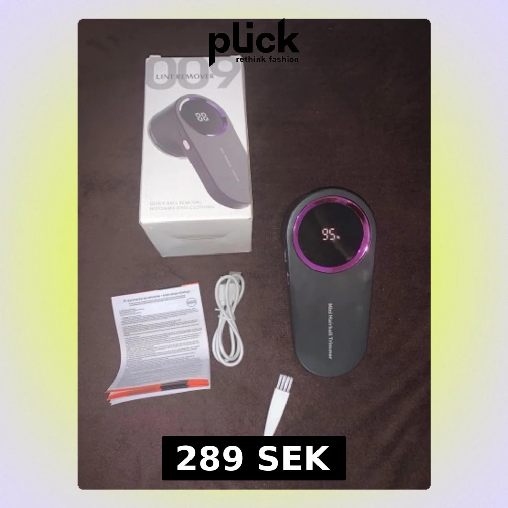 Elektrisk ludd- och nopprengörare i svart plast med lila detaljer och digital display. Levereras med USB-laddkabel, rengöringsborste och manual. Perfekt för att ta bort noppor från kläder och textilier.