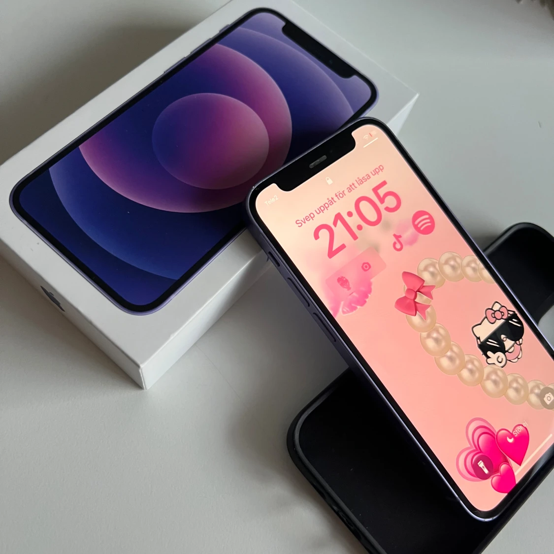 Snygg lila iPhone 12 i mycket gott skick, utan synliga repor eller skador. Levereras med originalkartong och flera roliga och färgglada skal. Dubbelkamera, Face ID och modern design. Perfekt för dig som vill ha en pålitlig och stilren mobil med extra tillbehör.