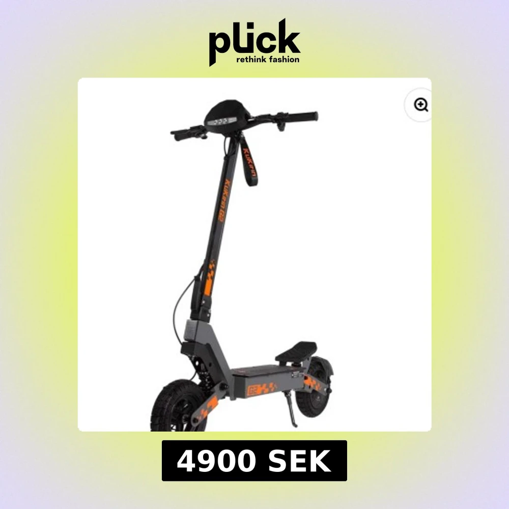Kukirin G2 el-scooter med robust design, stora luftfyllda däck och stötdämpning för bekväm körning. Utrustad med LED-display, stark motor och fotstöd. Snygg grå och orange finish, ser ut att vara i mycket gott skick utan synligt slitage.