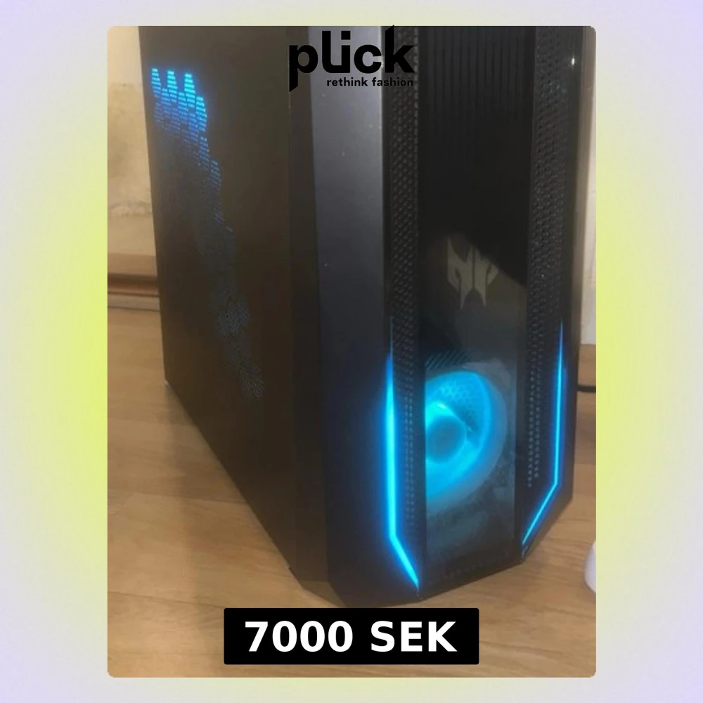 Acer Predator Orion 3000 gamingdator med RGB-belysning, Intel-processor och NVIDIA-grafikkort. Snygg design med frontfläkt och flera anslutningar. Datorn ser ut att vara i gott skick utan synligt slitage. Perfekt för gaming och krävande uppgifter.