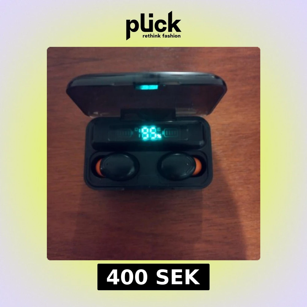 Snygga trådlösa hörlurar med laddningsetui och digital batteriindikator som även fungerar som powerbank.Hörlurarna har orange detaljer och etuiet har både USB och micro-USB-port. Skick: bra, inga synliga defekter eller större slitage. Perfekt för musik och samtal på språng.