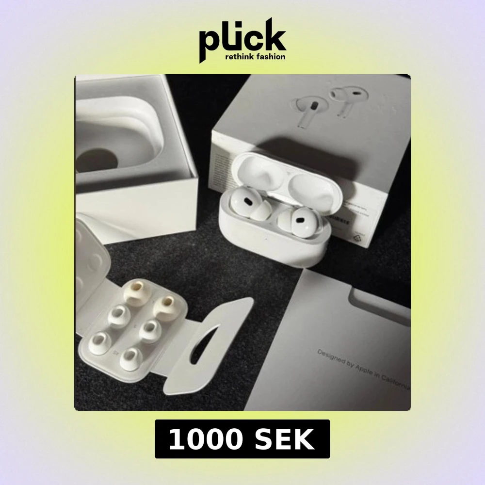 Apple AirPods Pro 2nd gen med originalförpackning, laddningsetui och extra öronproppar i olika storlekar. Aktiv brusreducering, transparensläge och trådlös laddning. Mycket gott skick, fullt fungerande och 100% batterihälsa. Minimalt slitage synligt.