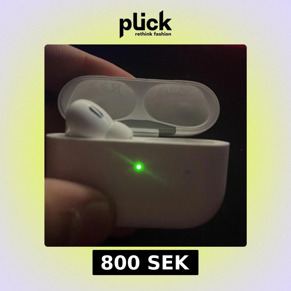 Apple AirPods Pro med laddningsetui. Trådlösa hörlurar med aktiv brusreducering och bekväm passform. Etuiet har synliga tecken på normalt bruk, men inga större skador. Grön LED indikerar laddning. Perfekt för musik, samtal och träning. Kommer bara med en lur och laddningssetui!