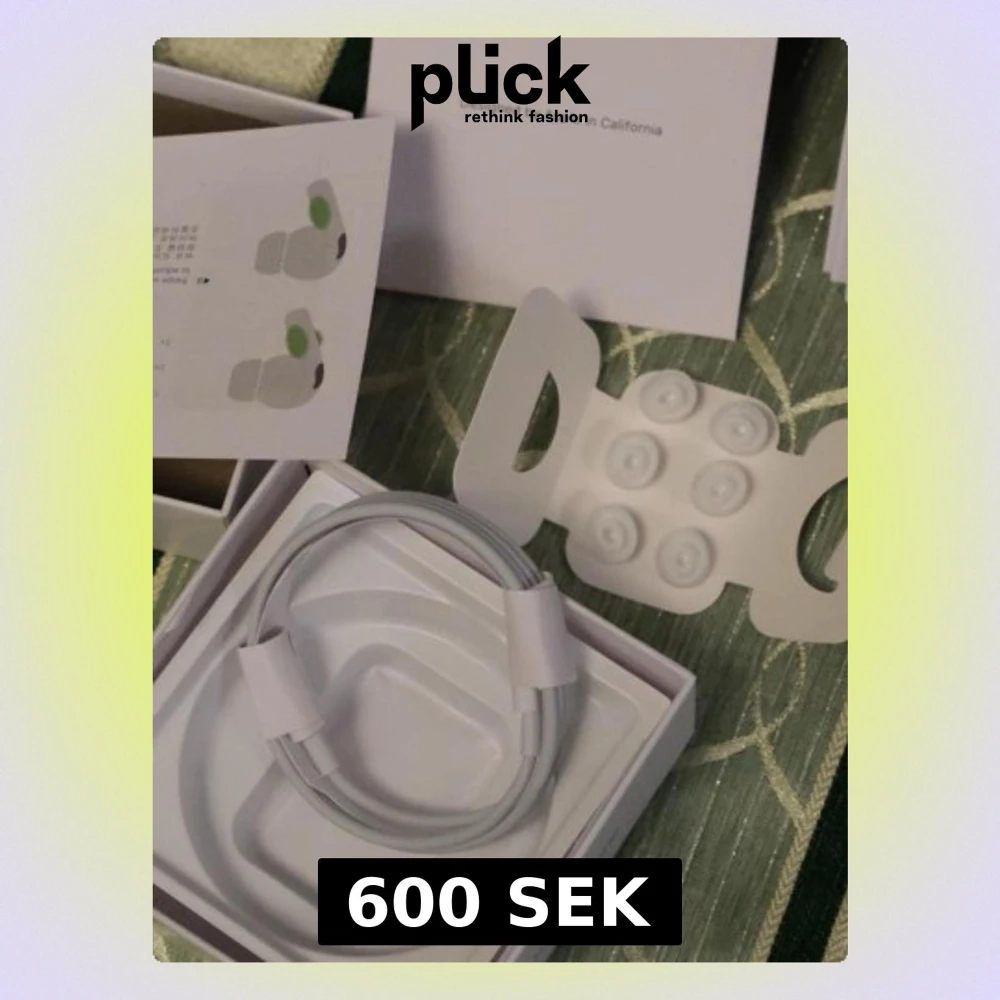 Apple AirPods Pro2 med laddningsetui, extra öronkuddar och laddningskabel. Produkten ser ut att vara i mycket gott skick, komplett med originalförpackning och manualer. Aktiv brusreducering och trådlös anslutning för bästa ljudupplevelse. Perfekt för musik, samtal och träning.