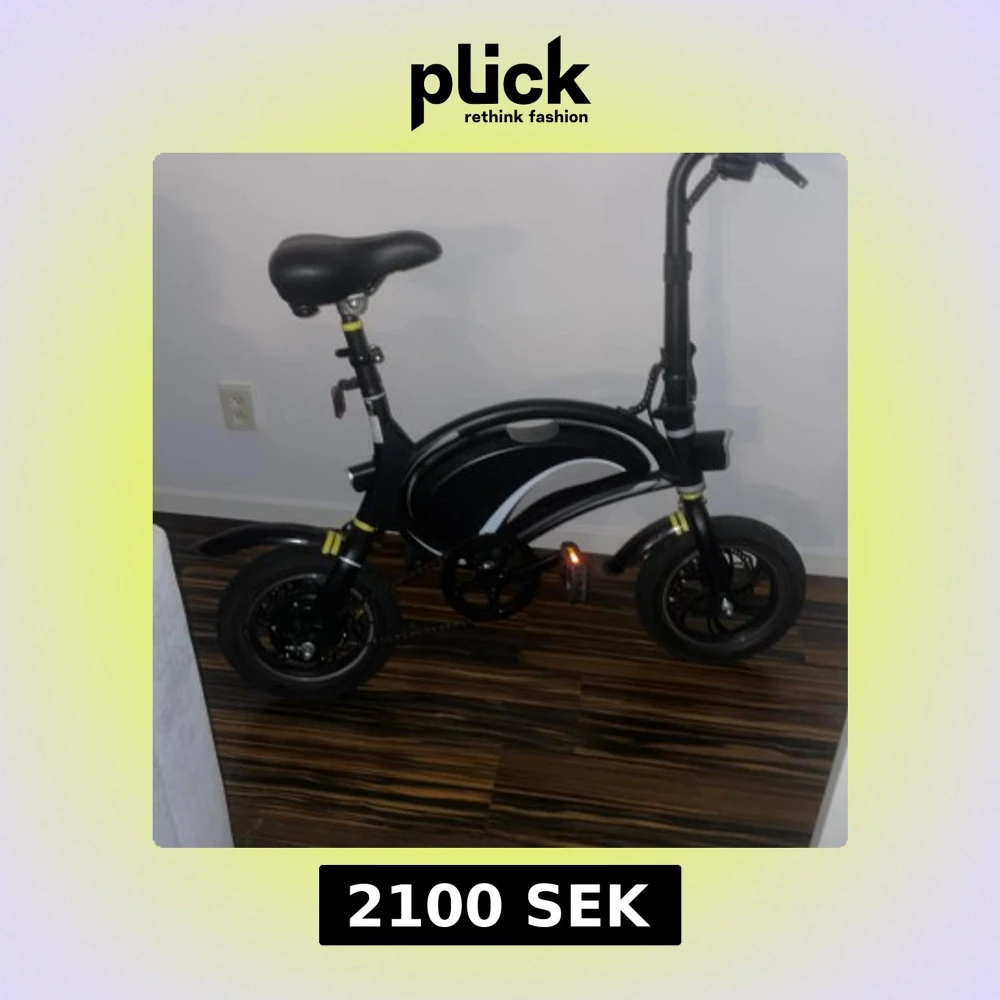 Kompakt elcykel från FREEV i svart med LED-display och justerbar sadel. Cykeln är i gott skick med minimalt slitage, perfekt för stadspendling. Utrustad med bak- och framljus samt reflexer för ökad säkerhet. Laddningsport och batteri integrerat i ramen.