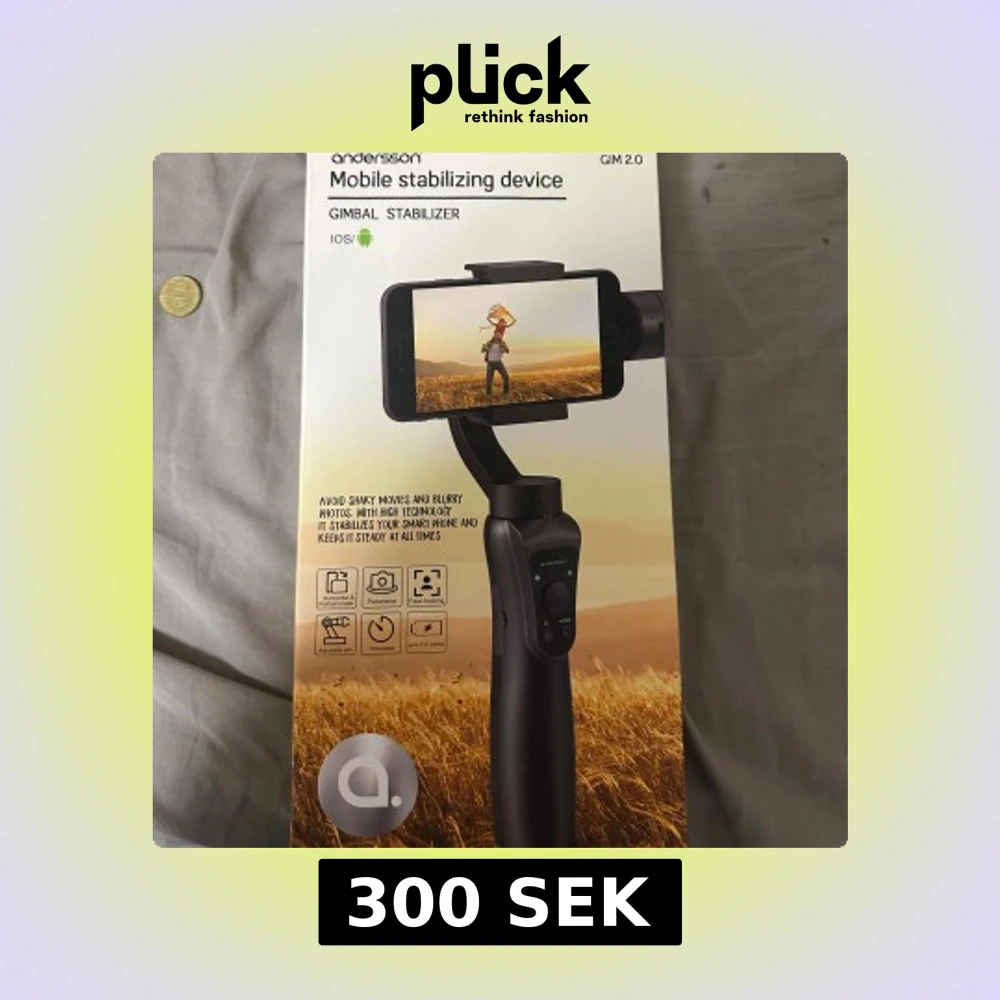 Andersson GIM 2.0 gimbal stabilizer för smartphone, Du placerar varan någon stans och ställer din mobil på , så följer den med dig och den håller mobilen väldigt bra så den inte vibrerar när du går. Bluetooth 4.1, USB-laddning, upp till 12 timmars batteritid. Stödjer både iOS och Android, panorama, face tracking, time-lapse och justerbar arm. Komplett med tillbehör, i mycket fint skick utan synligt slitage.