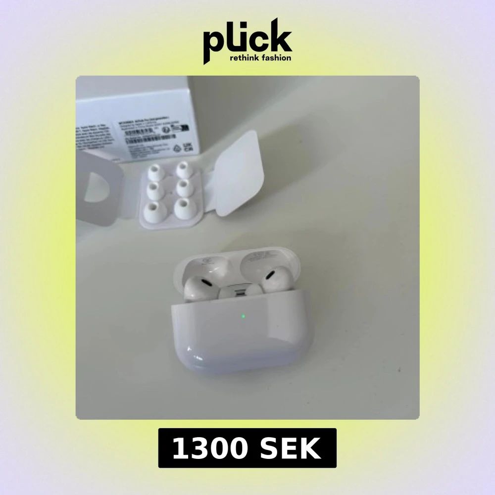 Apple AirPods Pro i mycket fint skick, komplett med originalförpackning, laddningskabel och extra öronproppar. Trådlösa hörlurar med aktiv brusreducering och laddningsetui. Inga synliga repor eller skador, ser nästan nya ut.