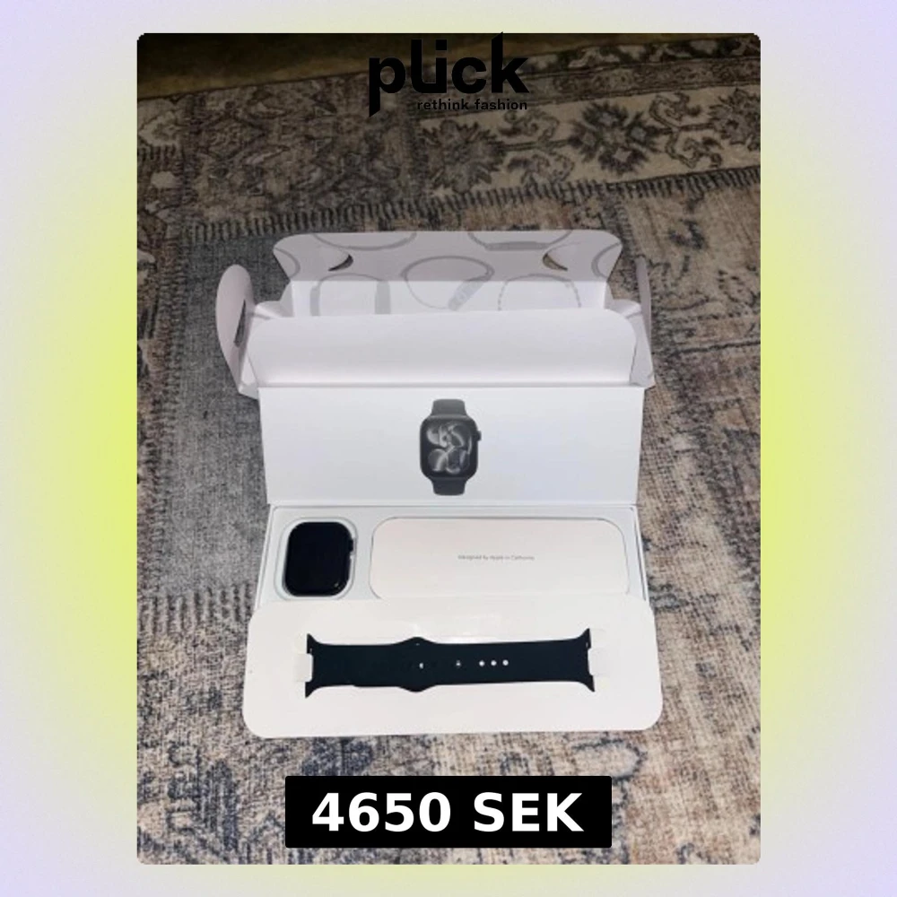 Apple Watch i originalförpackning, komplett med svart sportarmband och tillbehör. Produkten ser ut att vara i nyskick utan synliga repor eller skador. Perfekt för dig som vill ha en smartklocka med många funktioner och elegant design.