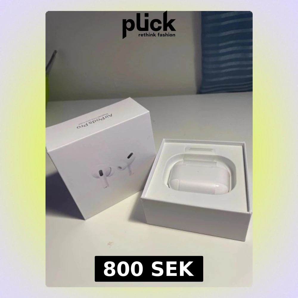 Säljer ett par AirPods Pro i originalförpackning med laddningskabel och tillbehör. Skick: mycket bra, inga synliga repor eller skador. Aktiv brusreducering och trådlös laddning. Perfekt för musik, samtal och träning. Levereras komplett med allt som syns på bilderna.