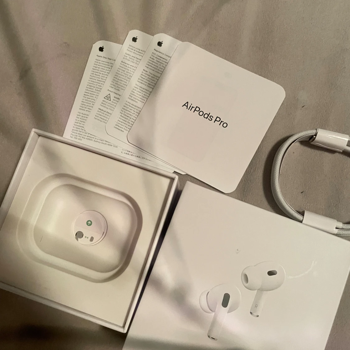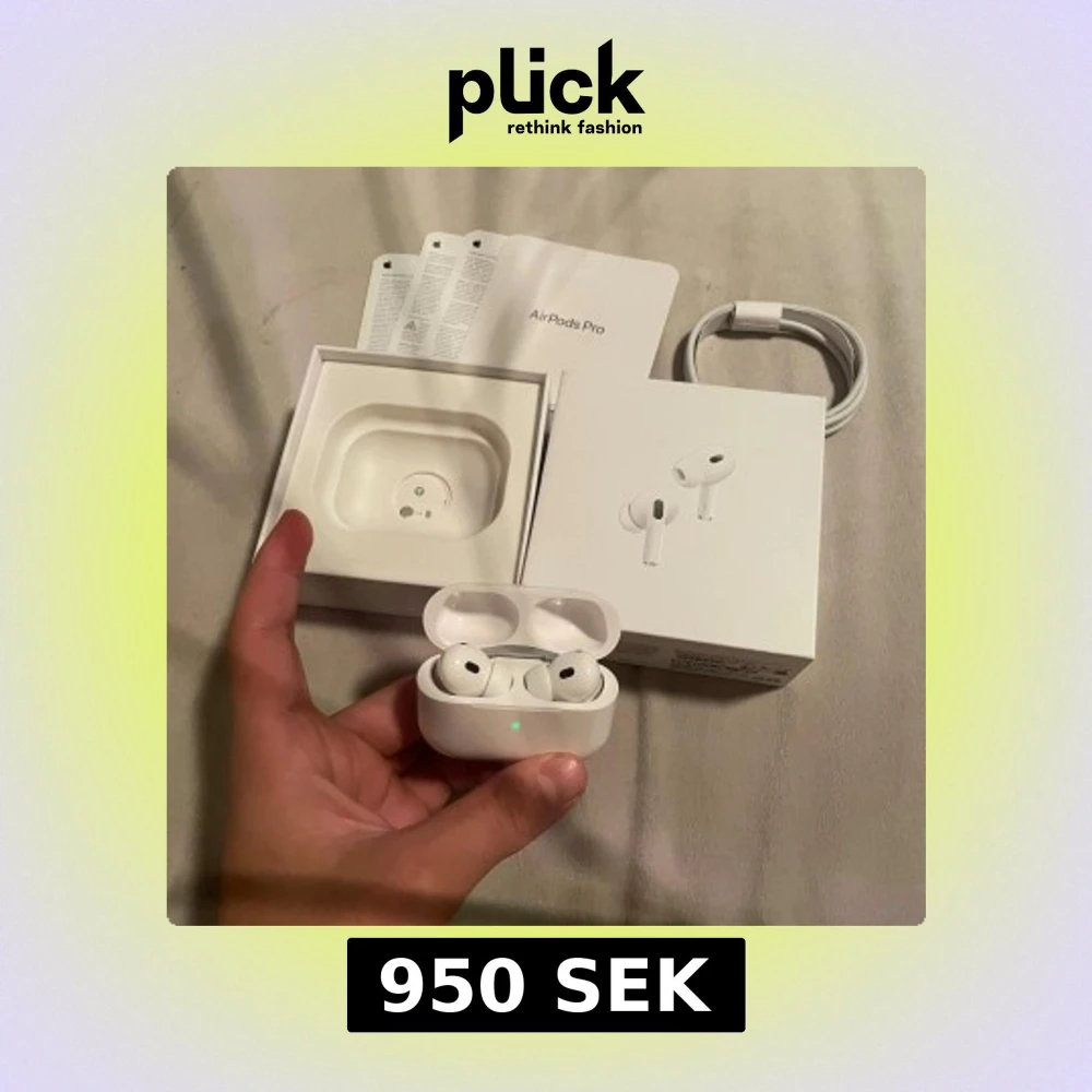 Apple AirPods Pro (2nd generation) i mycket fint skick, komplett med originalkartong, laddningskabel och manualer. Trådlösa hörlurar med aktiv brusreducering och MagSafe-kompatibelt laddningsetui. Inga synliga defekter eller slitage, ser ut som nya.