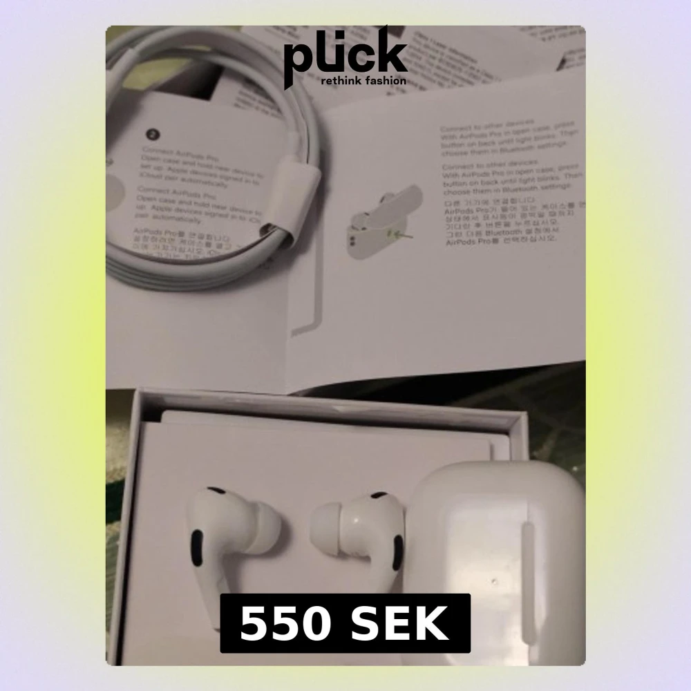 Apple AirPods Pro med laddningsetui, extra öronkuddar och laddningskabel. Produkten ser ut att vara i mycket gott skick, komplett med originalförpackning och tillbehör. Aktiv brusreducering och trådlös anslutning för bästa ljudupplevelse.