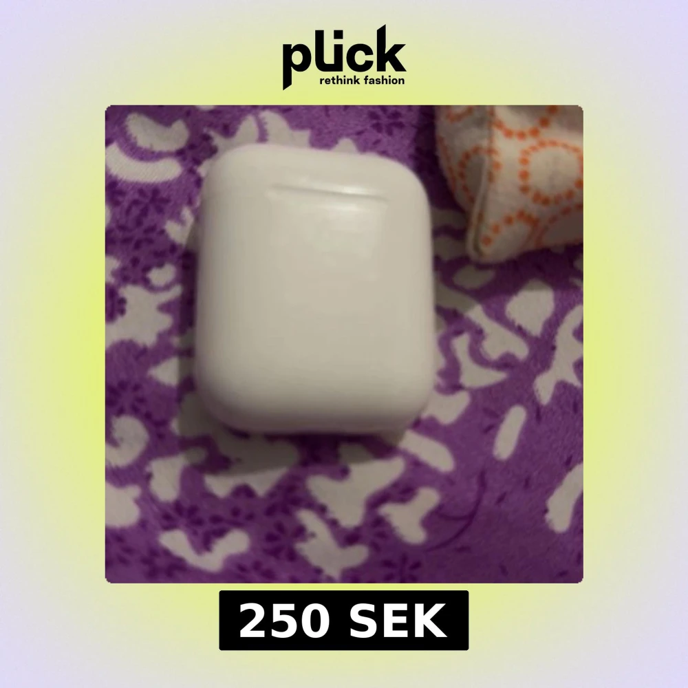 Apple AirPods 2 med laddningsetui. Trådlösa hörlurar med enkel anslutning till iPhone och andra Apple-enheter. Etuiet och hörlurarna visar tecken på användning och viss smuts, men fungerar och laddar som de ska. Perfekt för musik, samtal och träning.