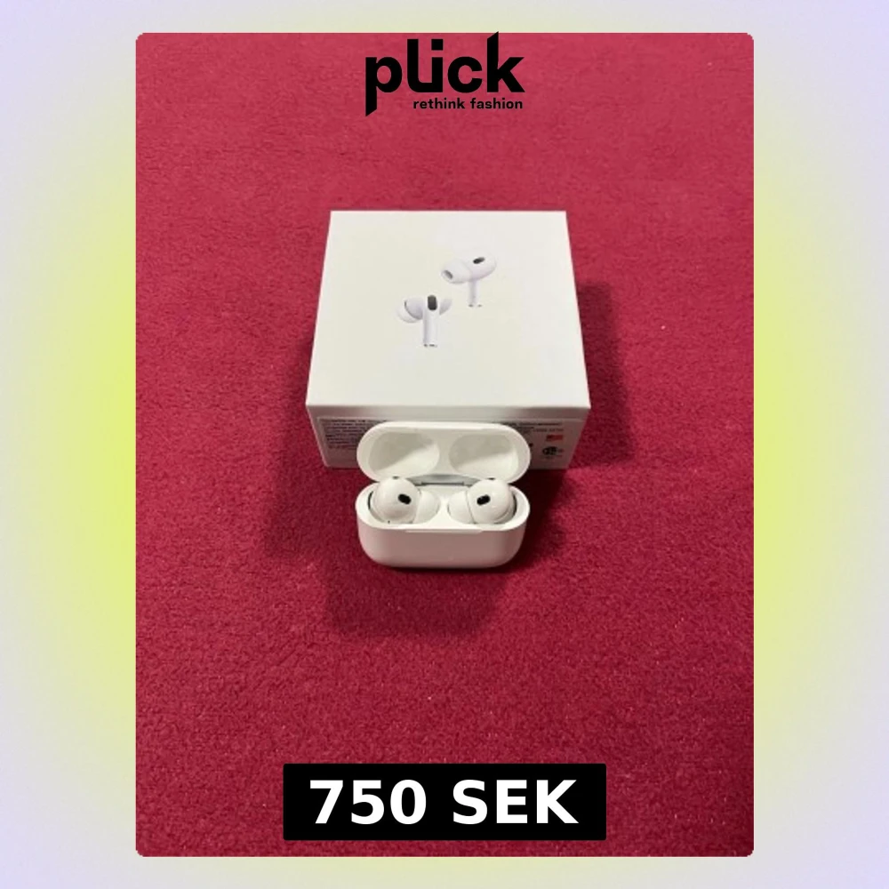 Apple AirPods Pro trådlösa hörlurar med laddningsetui, originalförpackning, laddningskabel och manual. Hörlurarna och etuiet ser ut att vara i mycket gott skick utan synligt slitage. Perfekt för brusreducering och hög ljudkvalitet.