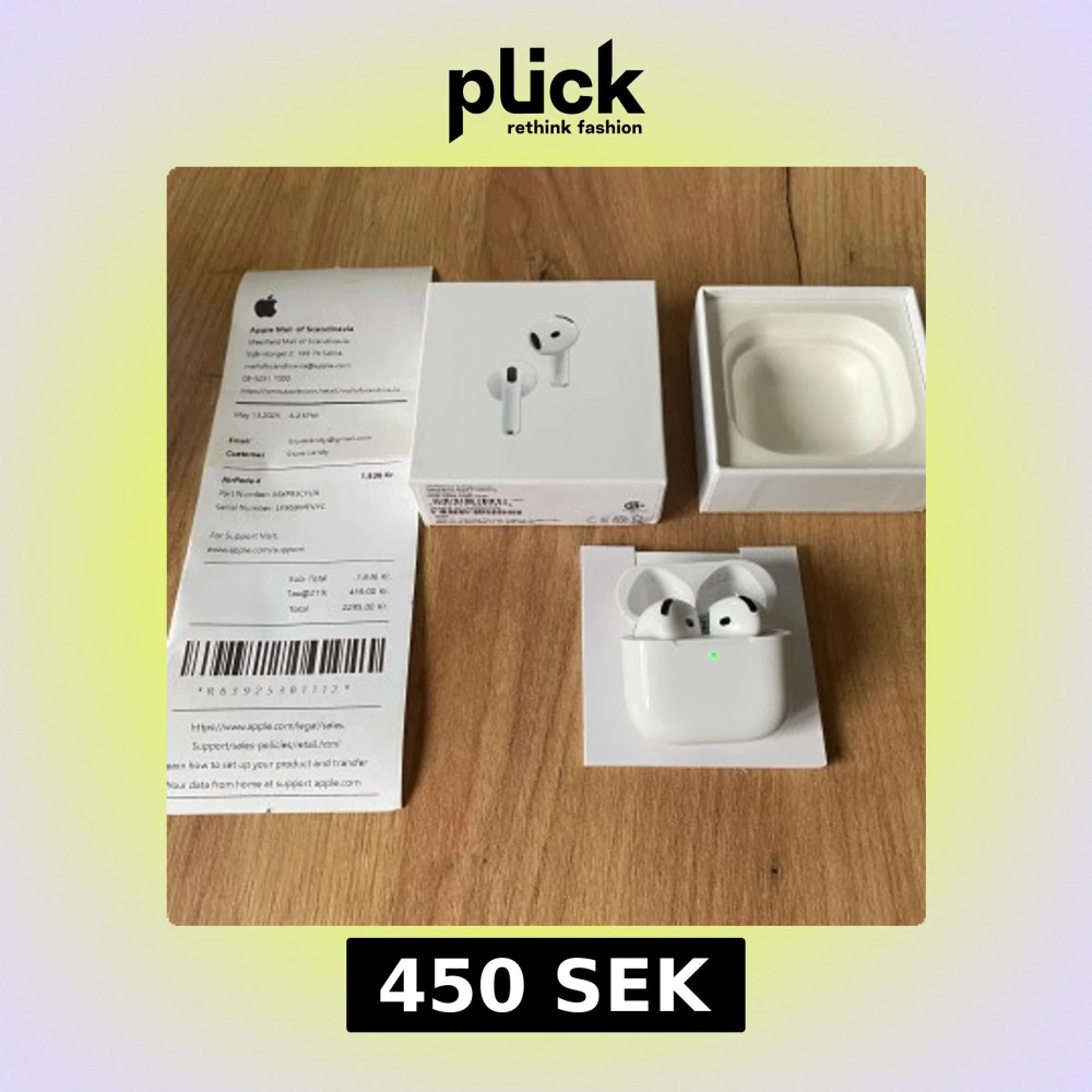 Säljer ett par Apple AirPods 4 i mycket fint skick, komplett med originalkartong och kvitto. Trådlösa hörlurar med laddningsetui, lång batteritid och smidig anslutning till Apple-enheter. Inga synliga repor eller skador, fungerar perfekt.