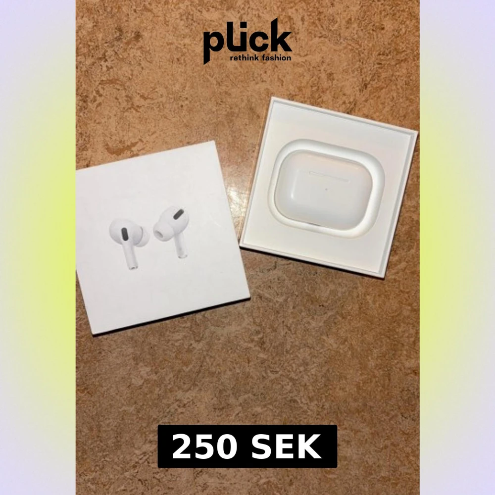 Apple AirPods Pro med originalförpackning och laddningsetui. Trådlösa hörlurar med aktiv brusreducering och silikonproppar för bästa passform. Skicket ser mycket bra ut utan synliga repor eller skador. Perfekt för musik, samtal och träning.